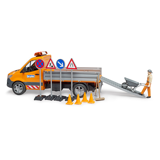 Průkopnický, efektivní, spolehlivý – tak Mercedes Benz popisuje nový Sprinter. I v nejnovější generaci zůstává všestranným a všeobecně oblíbeným dopravním profesionálem. Opravné a údržbářské práce na silnicích, chodnících a parcích jsou k vidění v každém městě a obci. MB Sprinter je díky své velikosti a variabilitě vozem pro tento typ práce. Vozidlo má sklopnou nakládací plošinu a boční stěny lze otevřít. Součástí dodávky jsou nájezdové rampy pro přepravu malých vozidel. Aby zábava mohla začít hned, je součástí dodávky stavební dělník spolu s kolečkem, nářadím, značkami a pylony. Sprinter je vybaven světelným a zvukovým modulem. Kromě tří různých zvuků sirény můžete pustit i zvuk motoru vozidla. Příštímu staveništi v dětském pokoji tedy nic nestojí v cestě. Měřítko: 1:16 Rozměr balení: 20,5 x 19,5 x 50,5 Věk: 4+ ... více