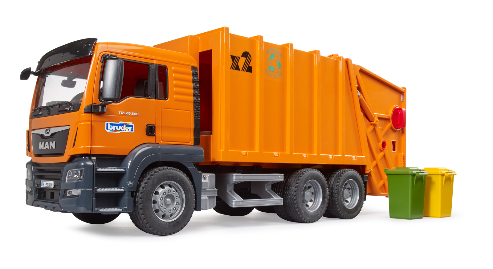 Moderní popelářské vozidlo s bočním nakladačem MAN TGS. Boční zvedák, který lze vysunout, uchopí popelnice a vyprázdní je bez potřeby druhé osoby. Dva šroubové lisy přepraví odpadky uvnitř nakládací korby, která se nakloní, aby se vysypaly po otevření zadního poklopu. Děti tak mohou reálně poznávat, jak probíhá svoz a recyklace odpadu. Dvě popelnice jsou součástí balení. Náklaďák lze snadno rozšířit o zvukové a světelné moduly 2801 a 2802. Měřítko: 1:16. Materiál: ABS plast. Rozměry auta: 54 x 19 x 25,7 cm. Rozměry balení: 28,5 x 19,5 x 58 cm. Věk: 4+