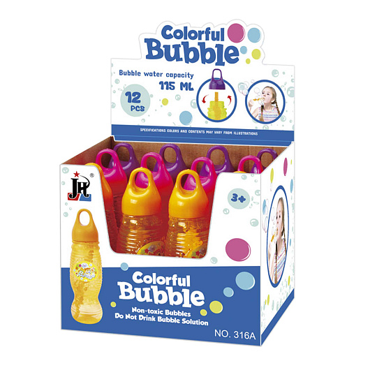 Barevná lahvička s bublifukem má obsah 115 ml. Foukátko je součástí víčka. Nekonečná zábava se spostou bublinek, kdo udělá větší? Komu první praskne a která doletí dál? Nelze vybrat druh, prodává se pouze po celém balení 12 ks.