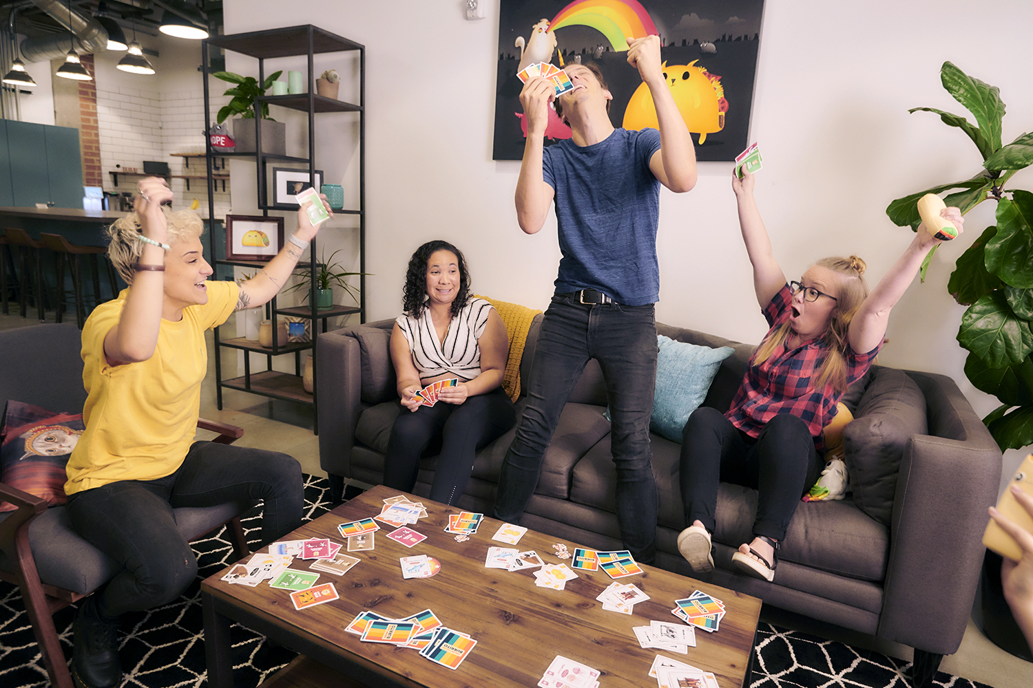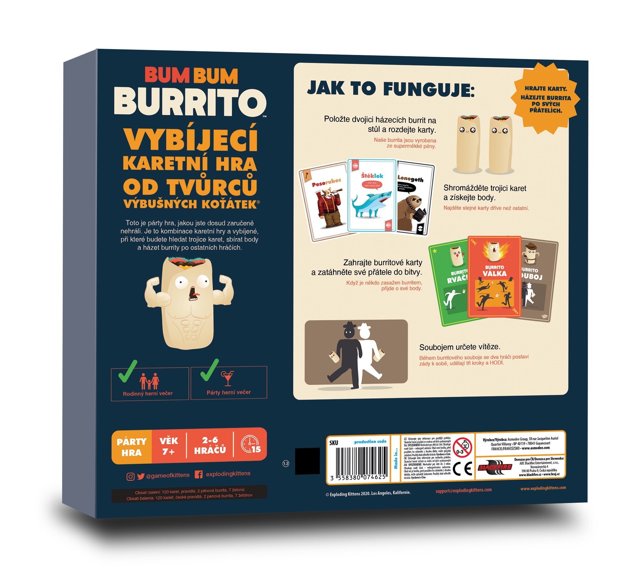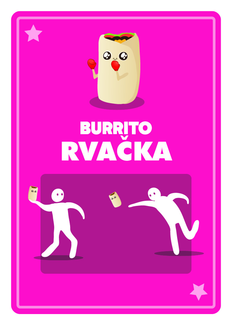 Toto je párty hra, jakou jste dosud zaručeně nehráli. Je to kombinace karetní hry a vybíjené, při které budete hledat trojice karet, sbírat body a házet burrity po ostatních hráčích.