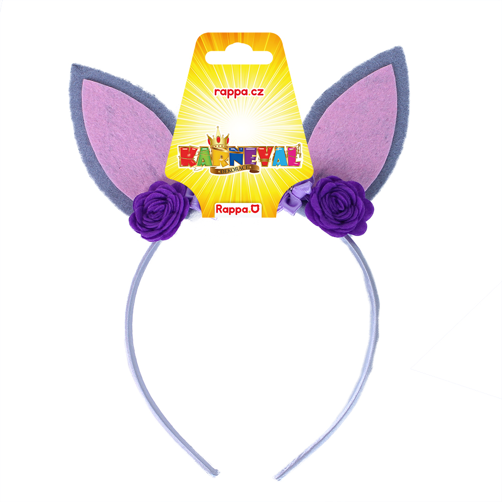 Nepřehlédnutelná karnevalová čelenka s ušima králíčka. Čelenka je ve fialové barvě, zdobená květy a doplněna rúžovo-šedými oušky.