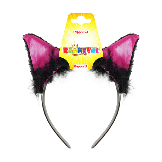 Karnevalová čelenka s kočičíma ušima růžovo-černé barvy a peřím je perfektním doplňkem ke kostýmu kočky.