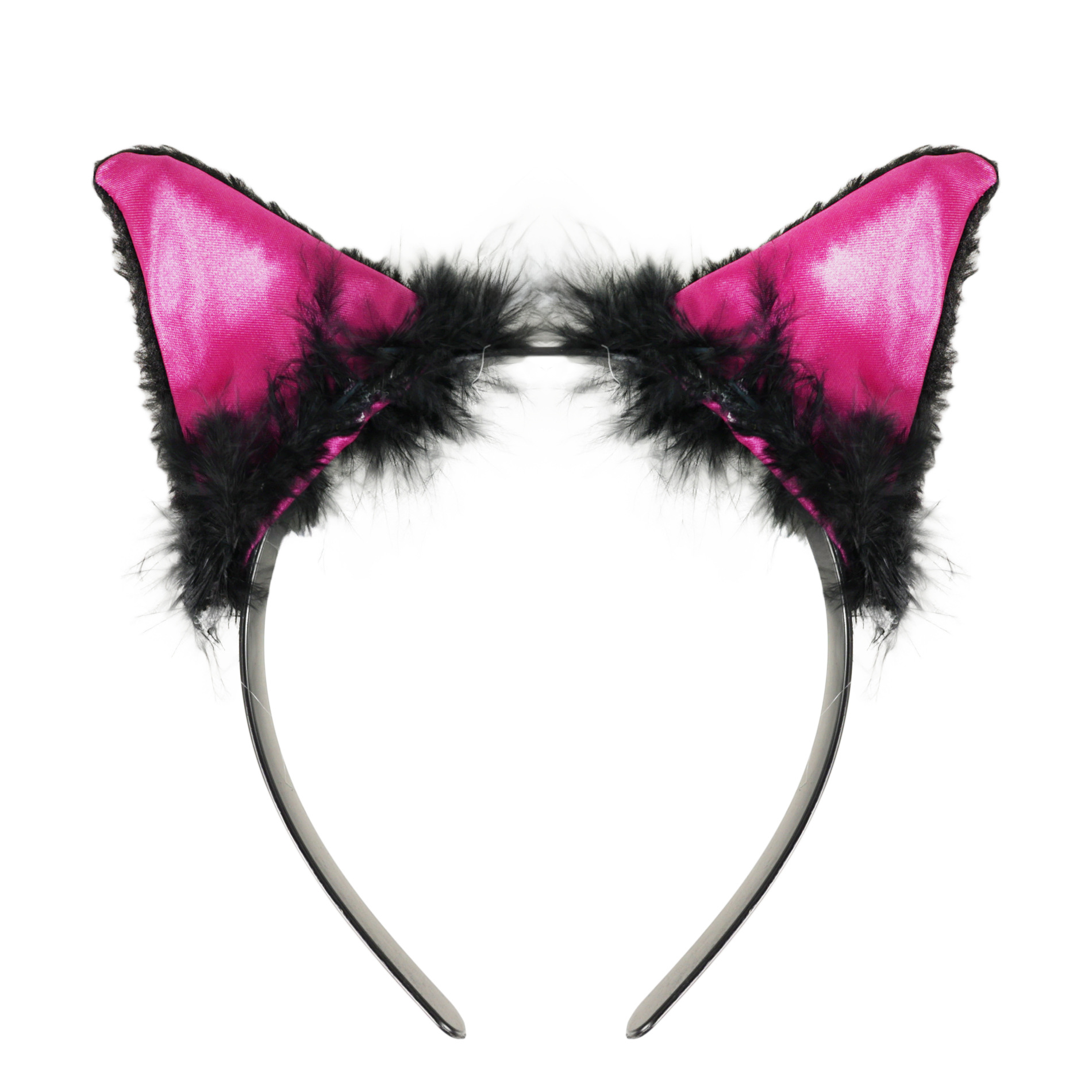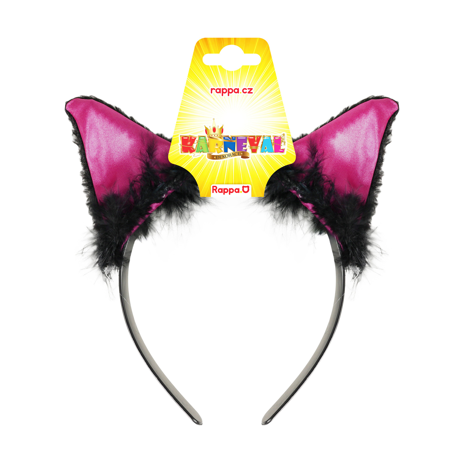 Karnevalová čelenka s kočičíma ušima růžovo-černé barvy a peřím je perfektním doplňkem ke kostýmu kočky.