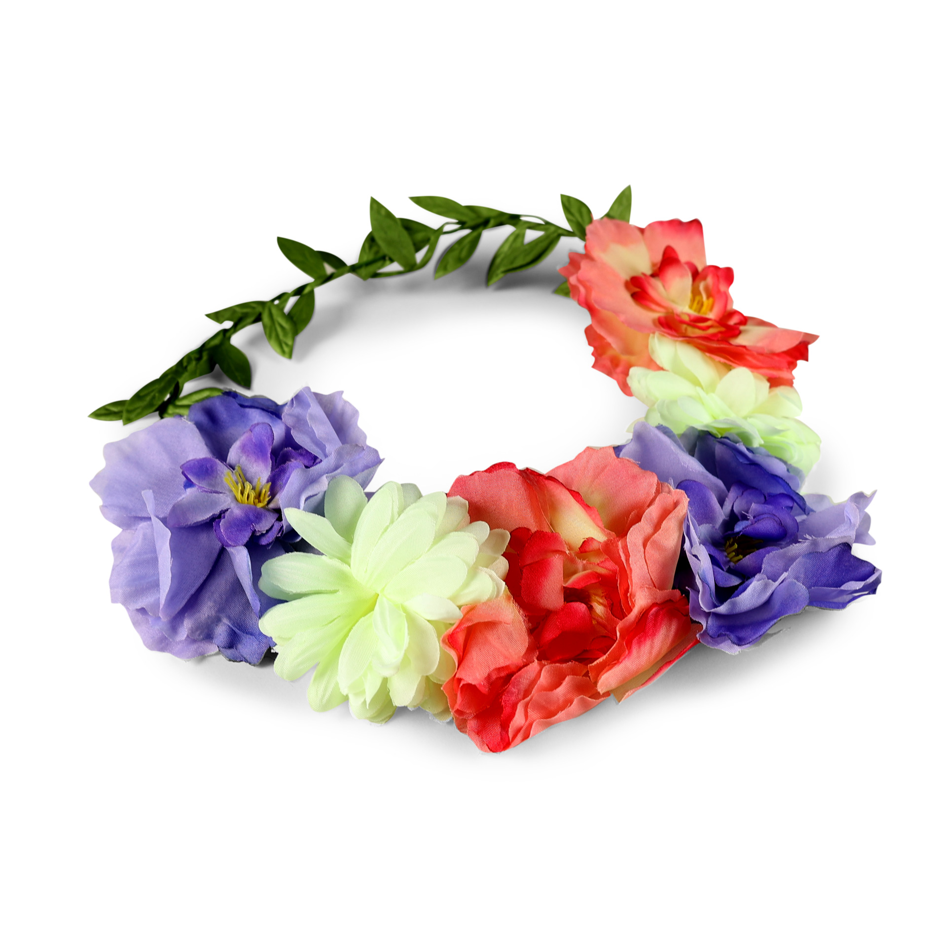 Věnec na hlavu je osázen pestrobarevnými květy a zelenými lístky. Báječná ozdoba do vlasů na párty nebo karneval.