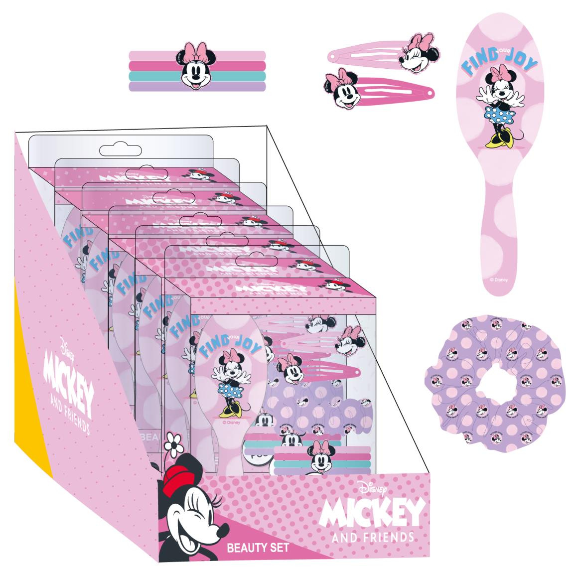 Dárkové balení doplňků do vlasů v licenci Minnie. Sada obsahuje 2 kovové sponky do vlasů s aplikací, 4 gumičky, okrasnou gumičku a hřeben.