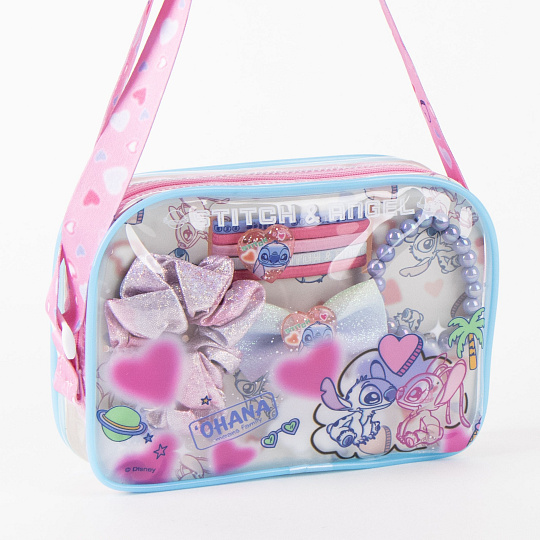 V praktické taštičce najede sponky do vlasů, gumičky, scrunchie a náramek v licenci Stitch