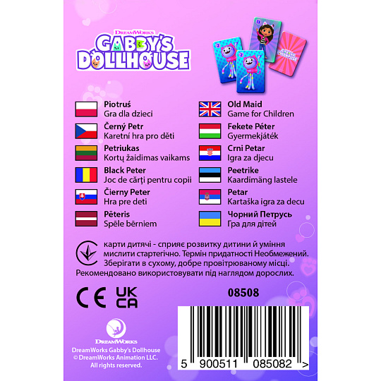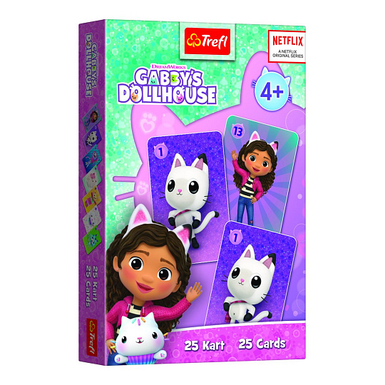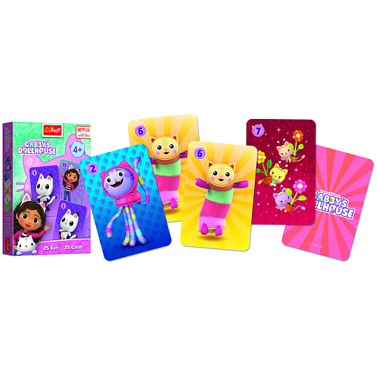 Kdo se zbaví všech svých karet se stejným označením a komu na konci hry zůstane v ruce Černý Petr? Hrou Vás budou doprovázet postavičky z oblíbeného seriálu Gabby. Karty: 25 karet - 12 dvojic označených stejnou číslovkou + 1 Černý Petr Rozměr krabičky: 6 x 9 cm Vhodné od 4 let