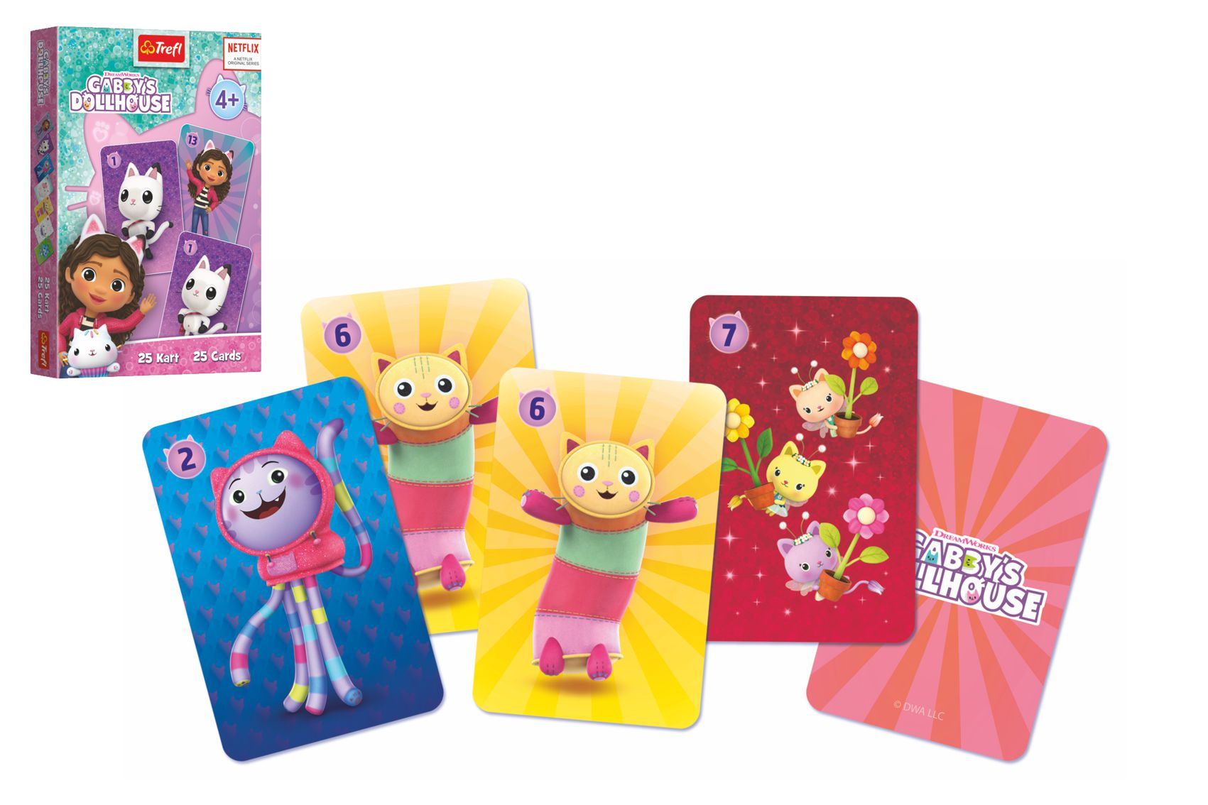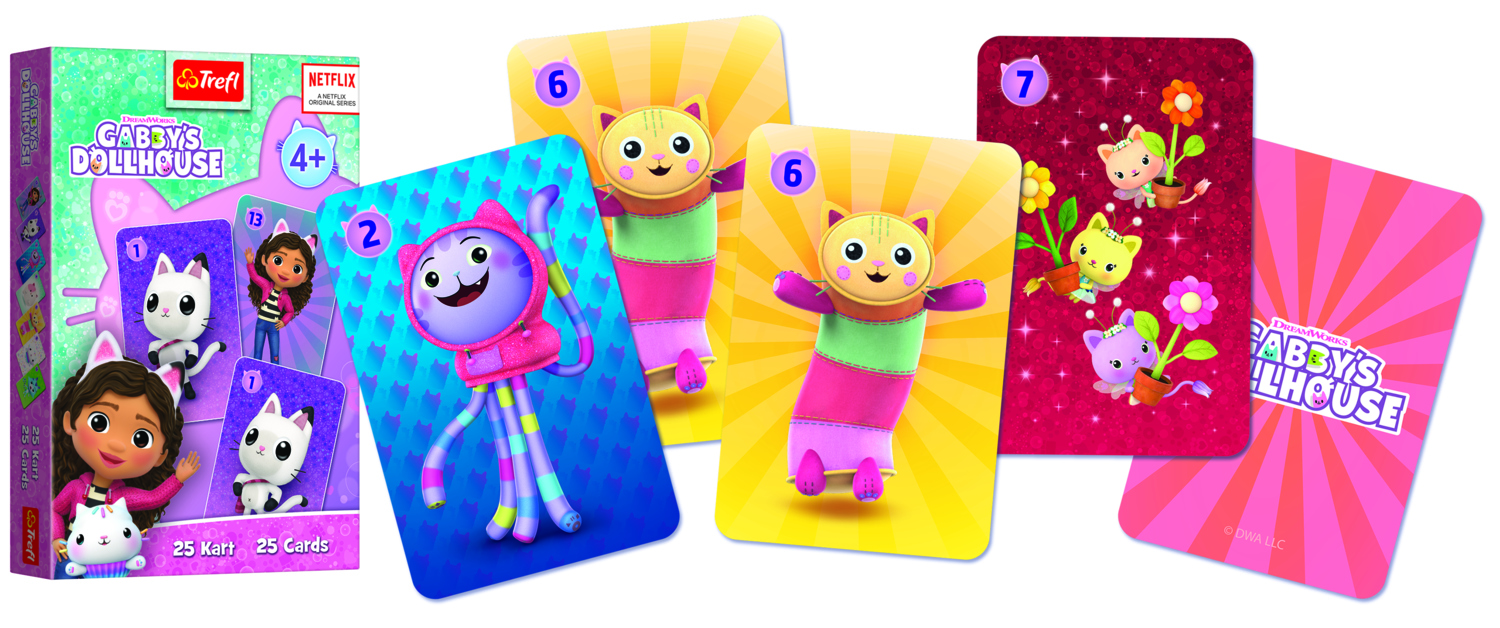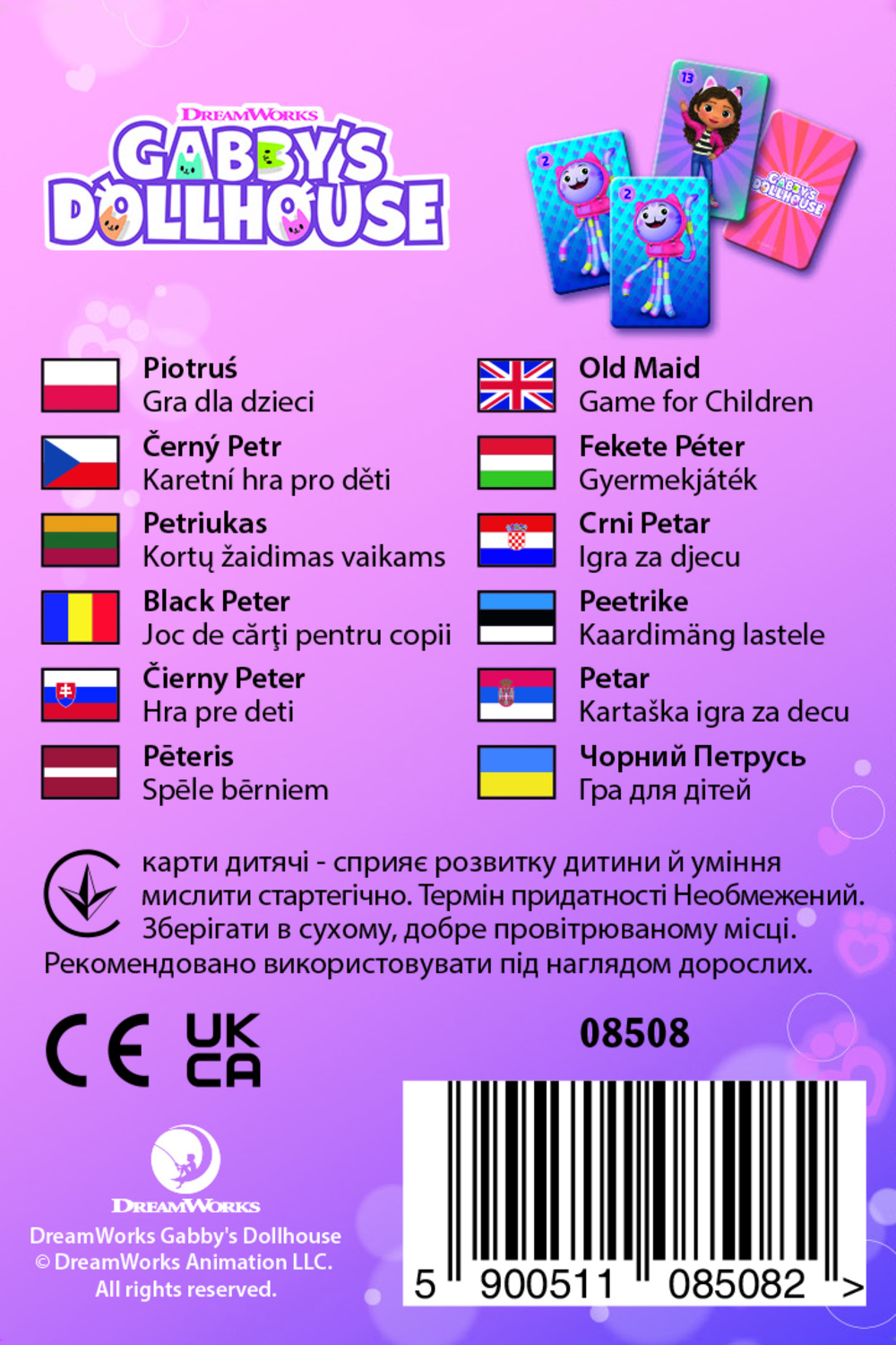 Kdo se zbaví všech svých karet se stejným označením a komu na konci hry zůstane v ruce Černý Petr? Hrou Vás budou doprovázet postavičky z oblíbeného seriálu Gabby. Karty: 25 karet - 12 dvojic označených stejnou číslovkou + 1 Černý Petr Rozměr krabičky: 6 x 9 cm Vhodné od 4 let