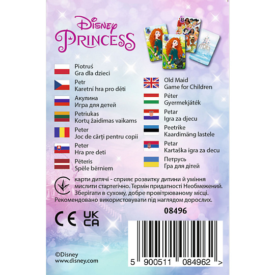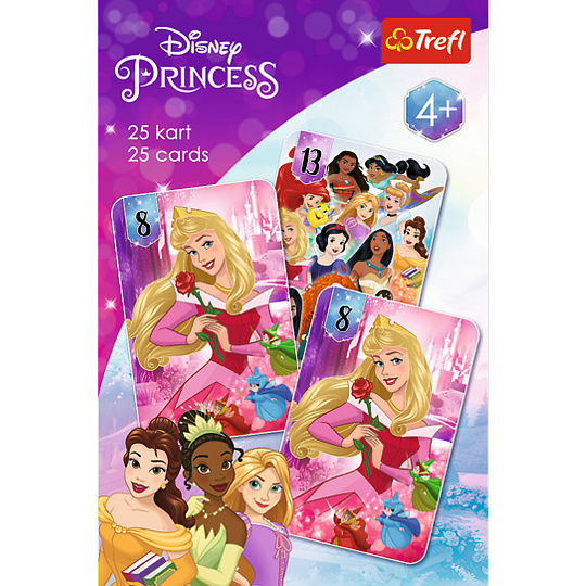 Kdo se zbaví všech svých karet se stejným označením a komu na konci hry zůstane v ruce Černý Petr? Hrou Vás budou doprovázet princezny z produkce Disney. Karty: 25 karet - 12 dvojic označených stejnou číslovkou + 1 Černý Petr Rozměr krabičky: 6 x 9 cm Vhodné od 4 let