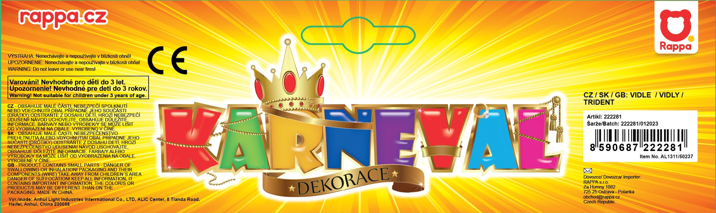 Čertovské vidle jsou nepostradatelným doplňkem k čertovské masce. Vhodné i na Halloween, maškarní ples nebo jinou párty. Tento trojzubec se skládá ze čtyř částí a díky tomu je dobře skladný. Délka vidlí po sestavení je 104 cm.