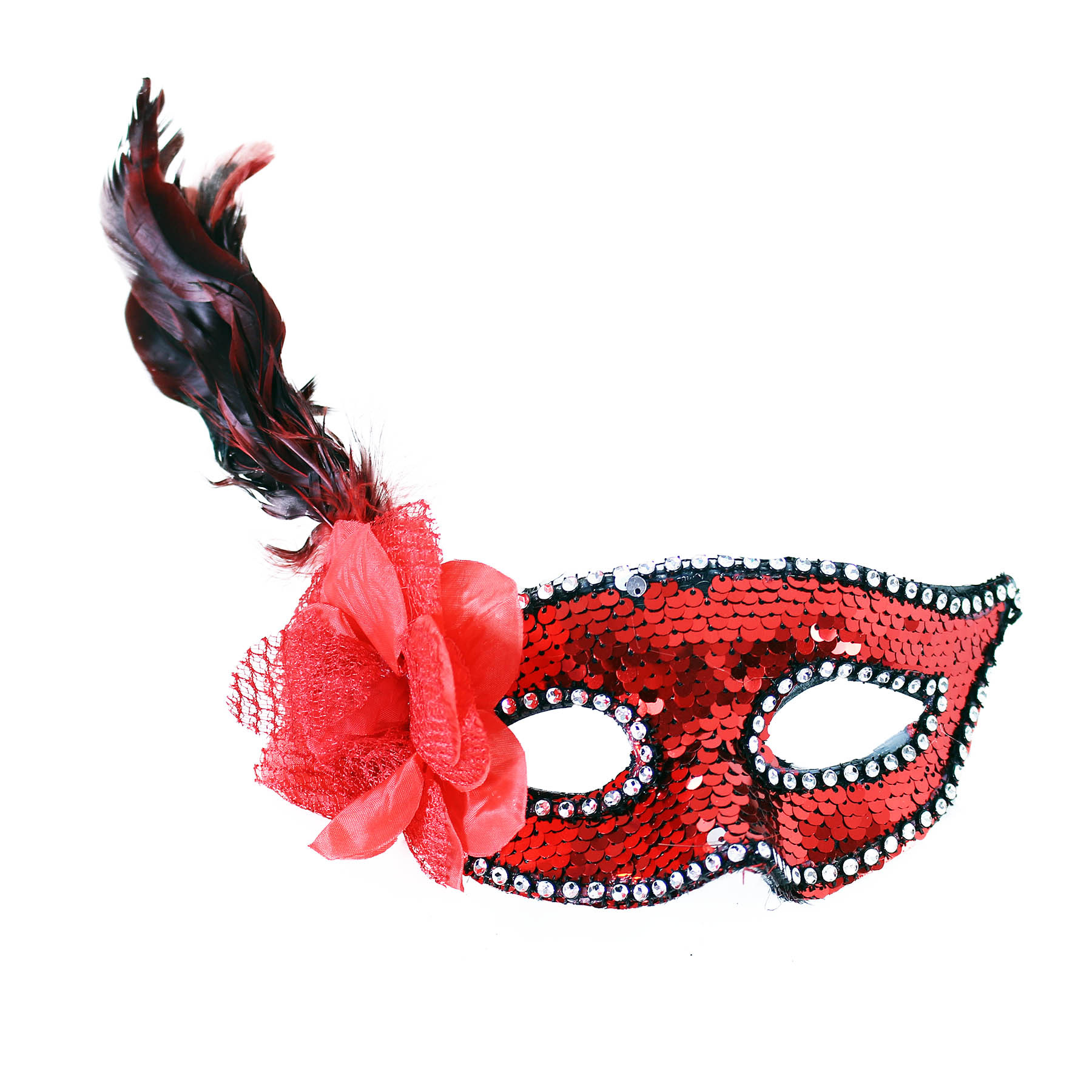 Červená elegantní škraboška na gumičku je zdobena flitry a lemována bílými zářivými kamínky. Na pravé straně je dekorována rudým květem a peřím.