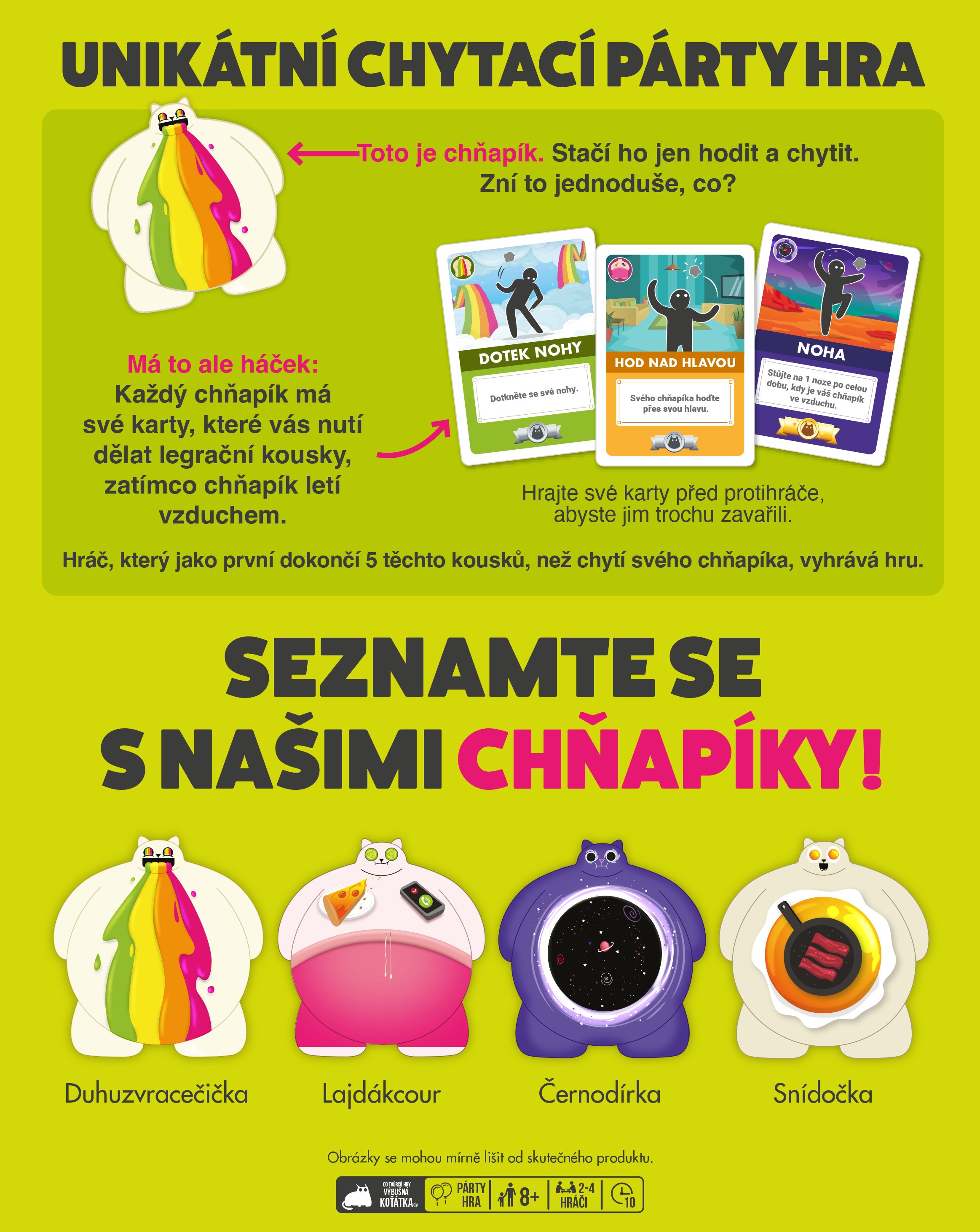 Až na vás přijde řada, vyhoďte svého chňapíka do vzduchu a chyťte ho, zároveň v tomto jednom hodu proveďte akce na VŠECH kartách akcí, co před vámi leží. Hru vyhrajete, pokud se vám podaří hodit a chytit chňapíka a splnit 5 karet akcí.