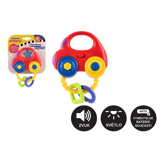 Barevné dětské chrastítko ve tvaru auta se díky svým veselým barvám stane velmi oblíbeným u nejmenších. Chrastítko po zmáčknutí tlačítek bliká, hraje melodie a vydává zvuky startujícího, jedoucího či troubícího auta. Chrastítko je na baterie 2x AG13, které jsou součástí hračky. Rozměr chrastítka: 10 x 11 cm vhodné pro děti od 3 měsíců