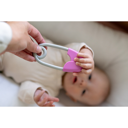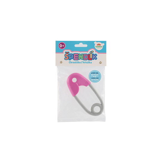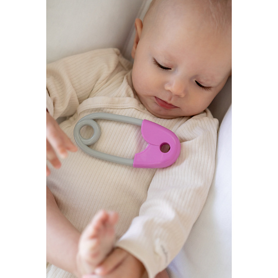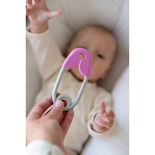 Chrastítko špendlík plast 12cm růžovošedé 12x19cm v sáčku 0m+