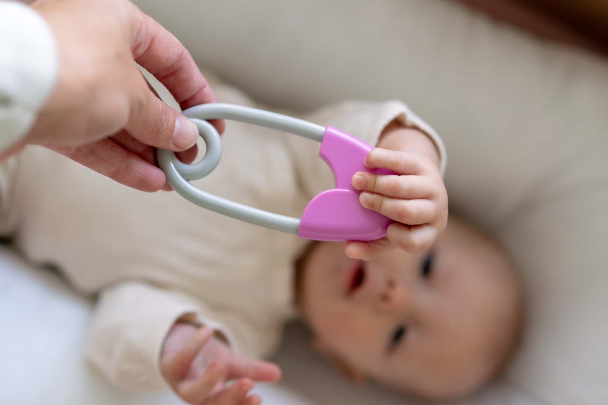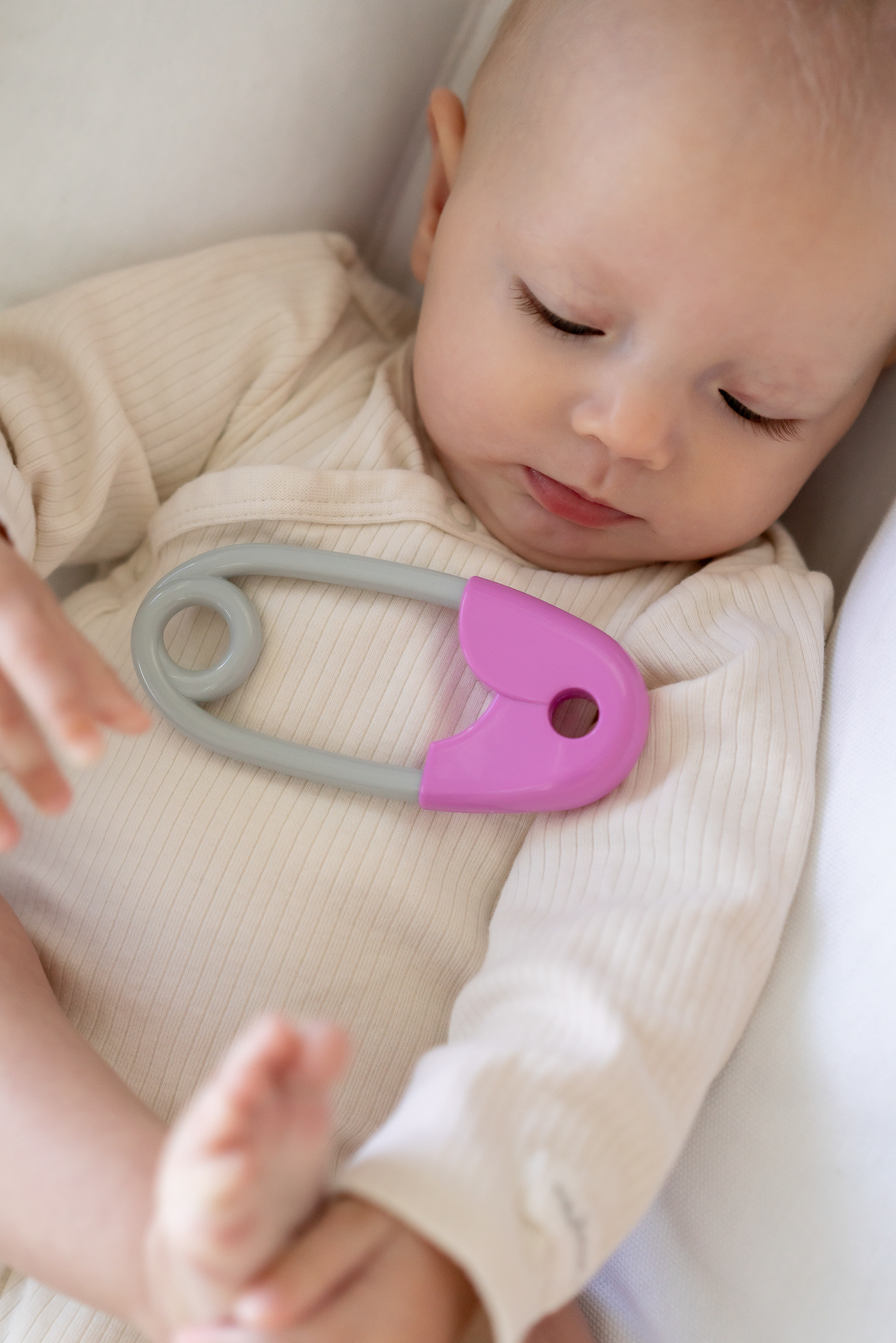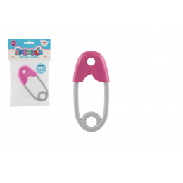 Chrastítko špendlík plast 12cm růžovošedé 12x19cm v sáčku 0m+