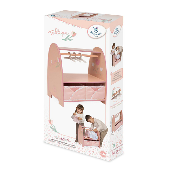DeCuevas 55874 Dřevěný šatní věšák na oblečení pro panenky Tulipe 2025 patří do stejnojmenné kolekce, která je novinkou roku 2025 a nabízí výběr výrobků od jídelních sad přes postýlky a kočárky až po dřevěný nábytek pro panenky. Tulipe je, jak již sám název napovídá, kolekce plná tulipánů v překrásně sladěných teplých pastelových lososových barvách. Světlejší a tmavší odstíny barev jsou vkusně doplněné drobným květinovým vzorem ve stejných tónech na bílosmetanovém podkladu. Tento motiv ještě navíc u kočárků umocňují svým tematickým tvarem i překrásné, jako tulipán vypadající tašky. Květ tulipánu zdobí i dřevěné výrobky této kolekce.Doplňky a vybavení:• Šatní tyč v pastelové barvě• 3 dřevěná ramínka • 2 odkládací místa z toho jedno na horní polici • 2 skládací košíky na různé drobnosti 21 x 20 x 11 cm (š x h x v)• Rozměry věšáku: 42 × 21 × 44 cm (š x h x v)• Oblečení a doplňky nejsou součástí baleníDoplňující informace:• Nádherný španělský design• Precizní zpracování• Materiál: MDF, masivní dřevo, kov• Baleno v krabici v barvách kolekce• Rozměry balení: 21,6 x 7,2 x 45 cm (d x š x v) • Váha balení: 3 kg• U vybraných modelů je na obalech QR kód s videonávodem na sestavení • Doporučený věk od 3 letDeCuevas 55874 Dřevěný šatní věšák na oblečení pro panenky Tulipe 2025 ze stejnojmenné kolekce, která je novinkou roku 2025, je díky svým jemným pastelovým barvám krásným doplňkem dívčího pokojíčku a potěší jistě každou malou slečnu. Šatní tyč s ramínky poskytne dostatek prostoru pro u