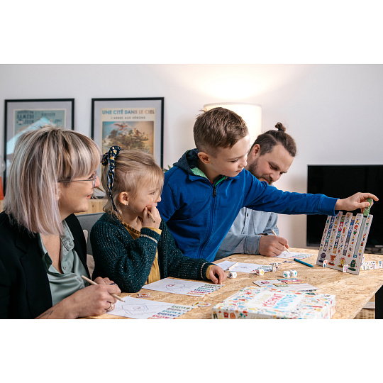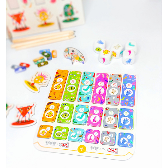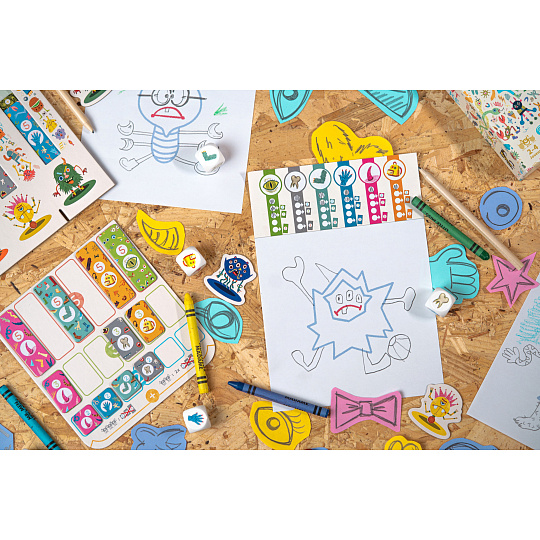 - Nakreslí vybranou část na svou příšeru. Mezitím si hráč po jeho levici vybere jednu ze zbylých kostek a položí ji před sebe. Také si zaškrtne políčko odpovídajícího symbolu a nakreslí část příšery. Tyto kroky provedou jeden po druhém všichni hráči.