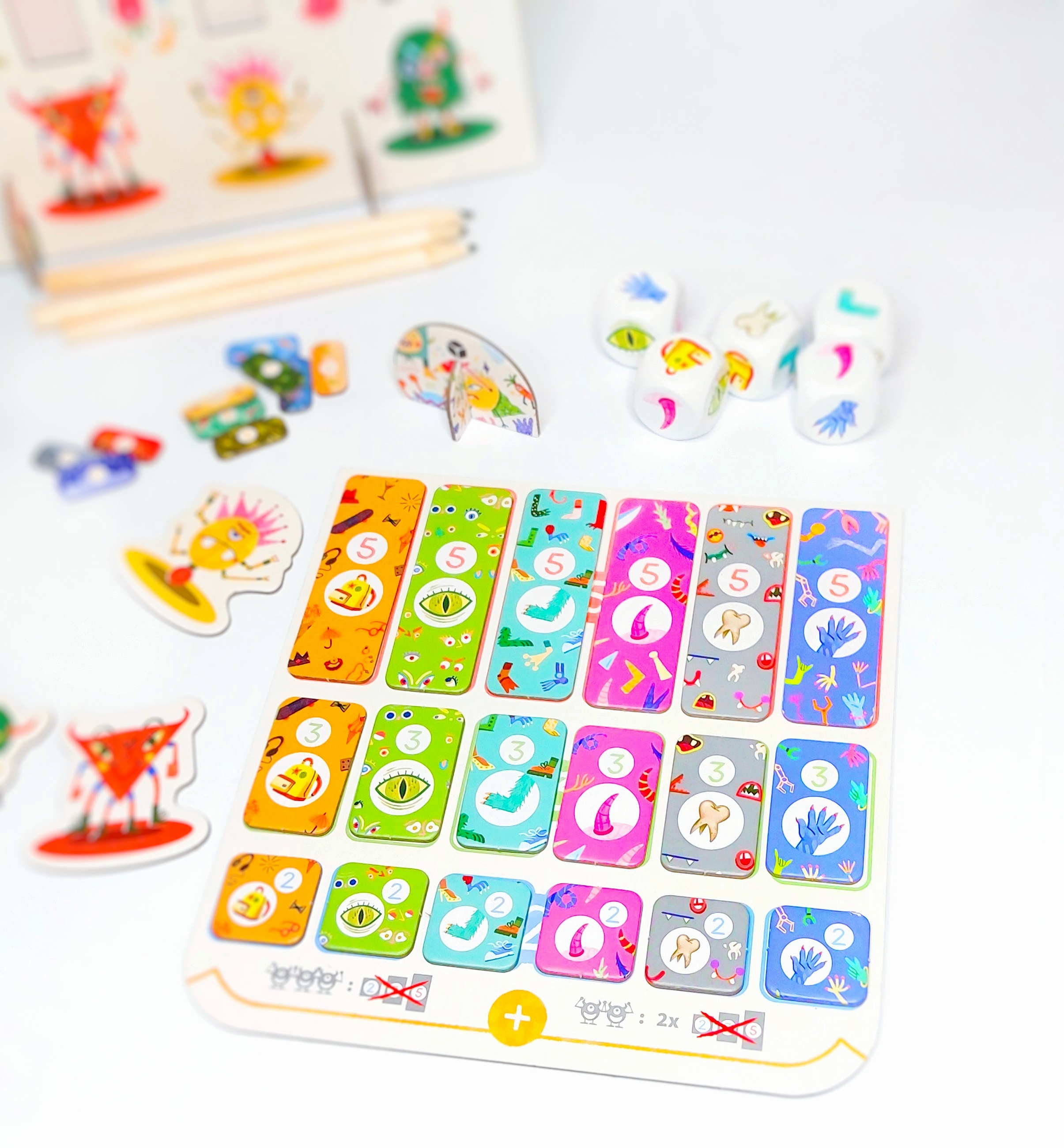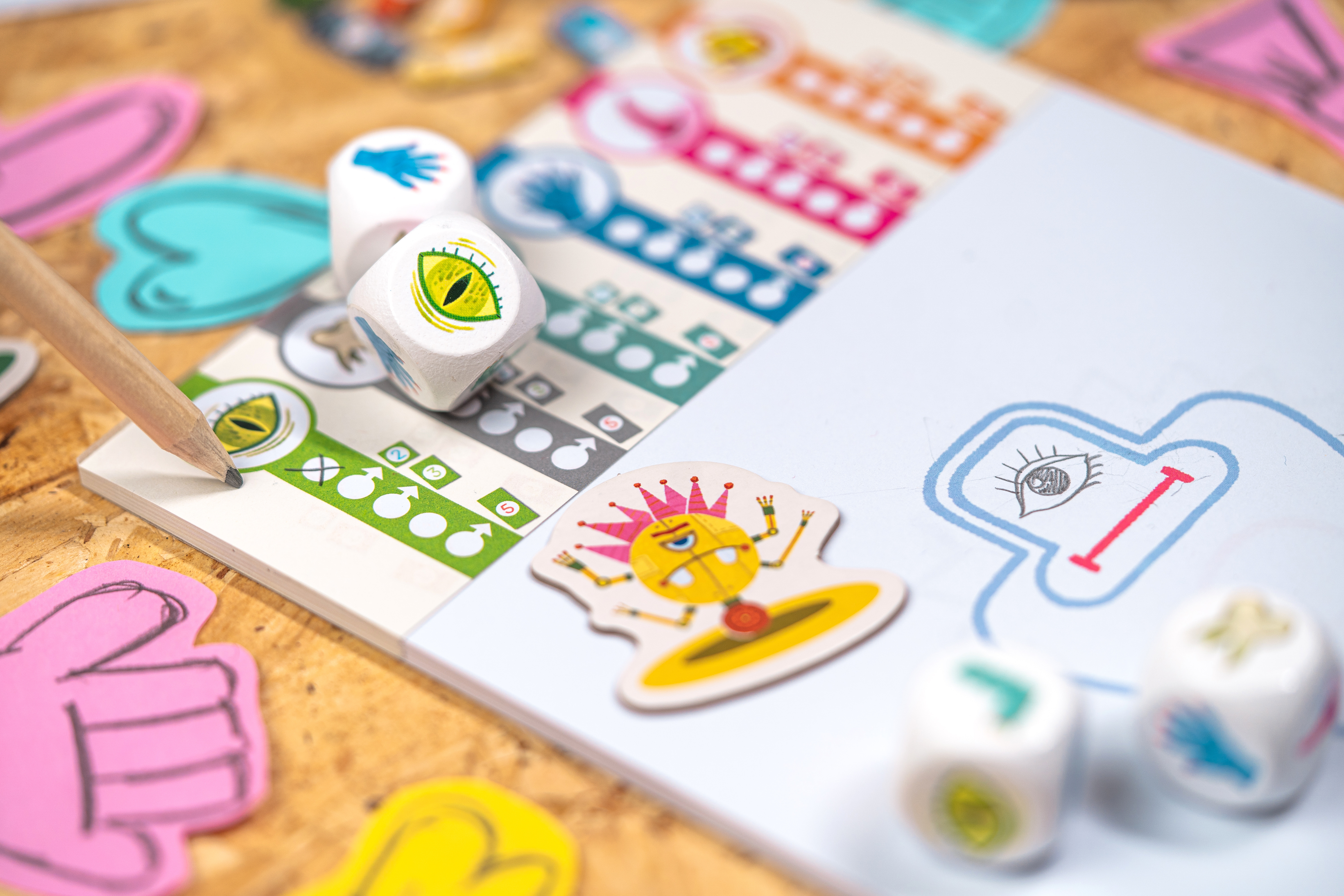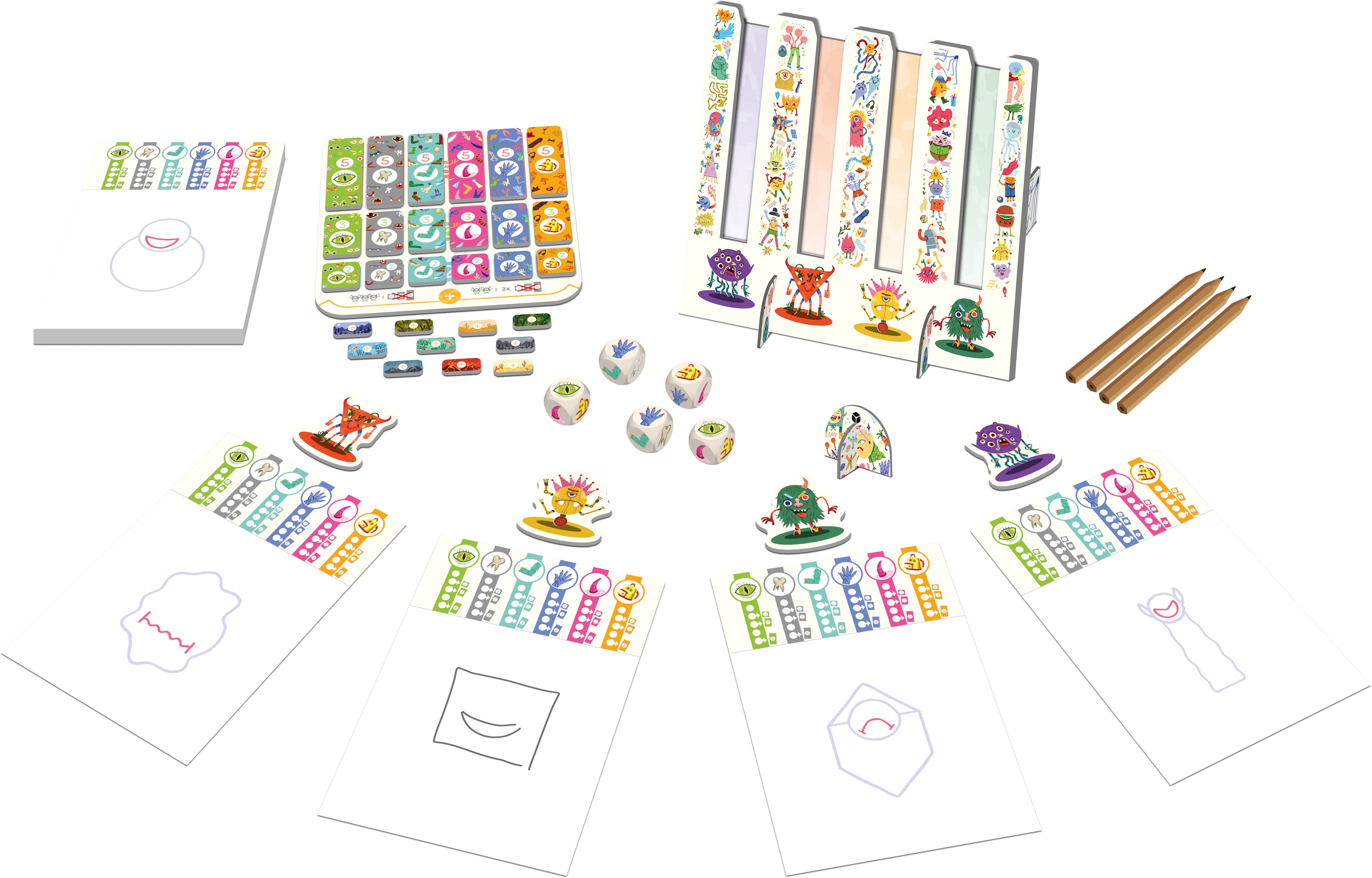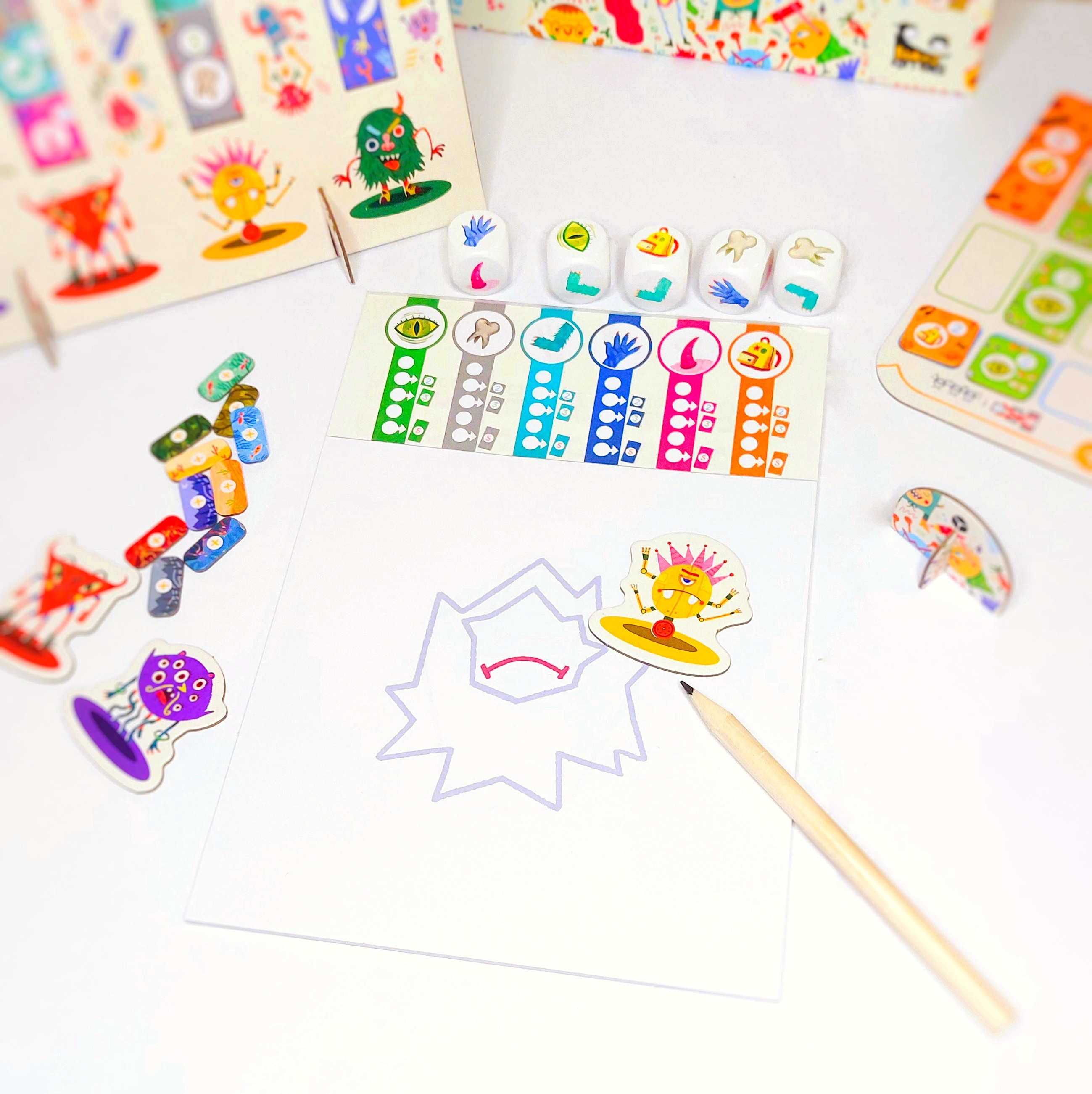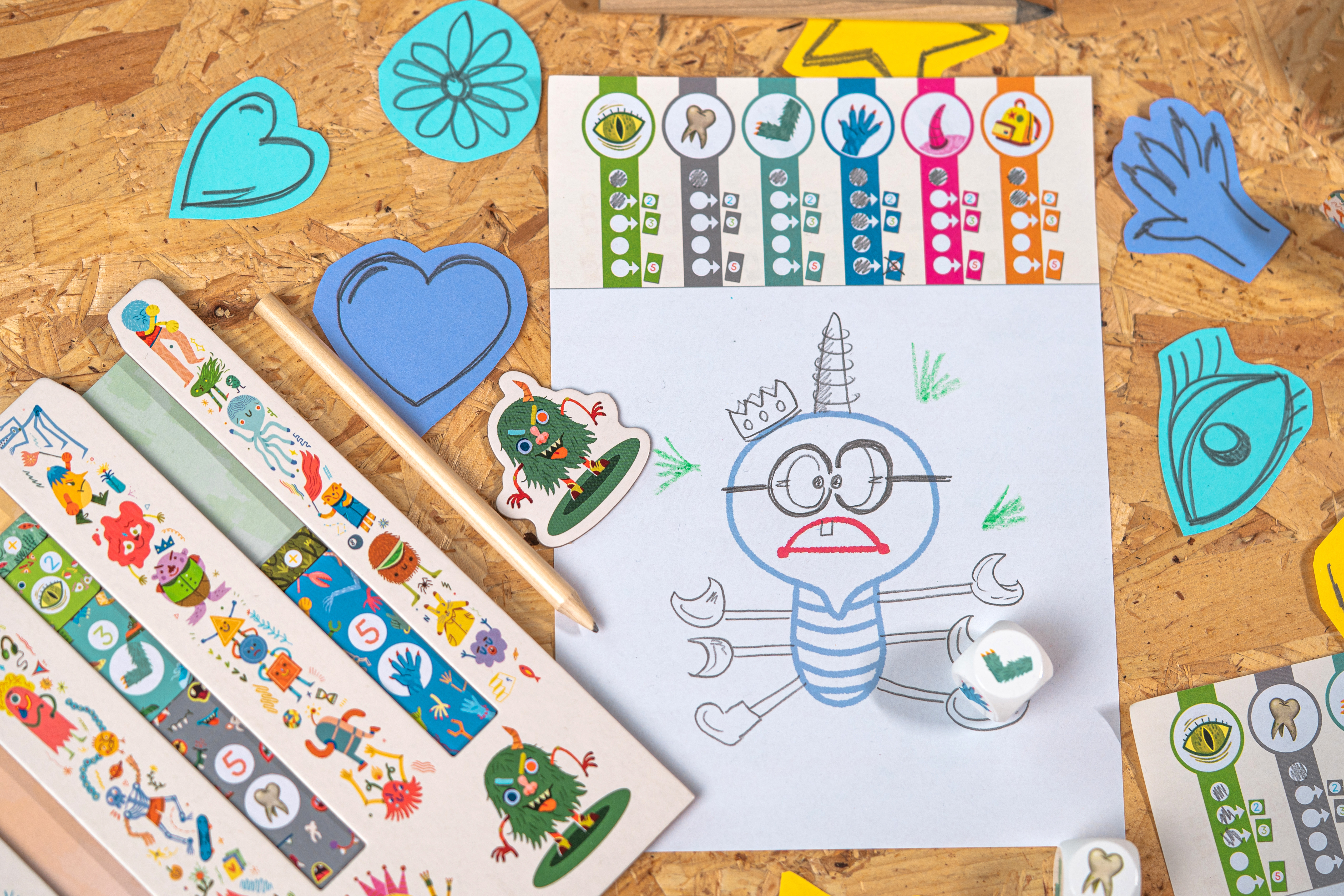 - Nakreslí vybranou část na svou příšeru. Mezitím si hráč po jeho levici vybere jednu ze zbylých kostek a položí ji před sebe. Také si zaškrtne políčko odpovídajícího symbolu a nakreslí část příšery. Tyto kroky provedou jeden po druhém všichni hráči.