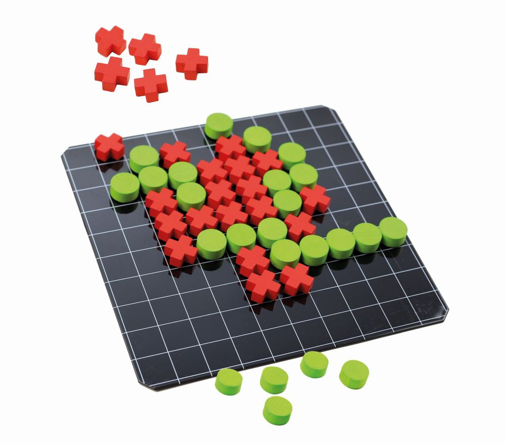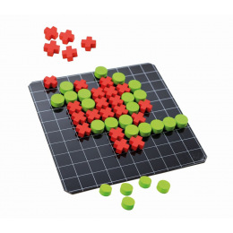 Oblíbená strategická hra pro dva hráče v cestovním provedení. Hra obsahuje plechovou tabulku o rozměrech 165x165 mm a dřevěné herní kameny (kolečka O 15 mm a kříže 16x16 mm) podlepené magnetem.