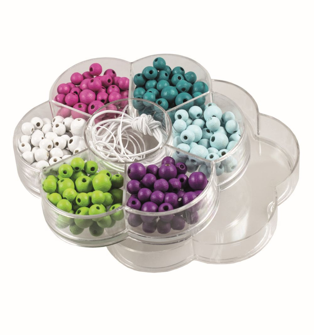 Kreativní sada v podobě dřevěných perliček a navlékacích nití je zábava, při které si vaše děti procvičí šikovnost prstíků.\nNavlékací nitě jsou ohebné a elastické, takže se s nimi dobře pracuje, a navlékaní jde pěkně od ruky.\n\nSada obsahuje 30x6 různě velkých perliček od barvy a dva druhy různě širokých navlékacích nití\n\nRozměry perliček: ?0,5 cm ~ ?1 cm