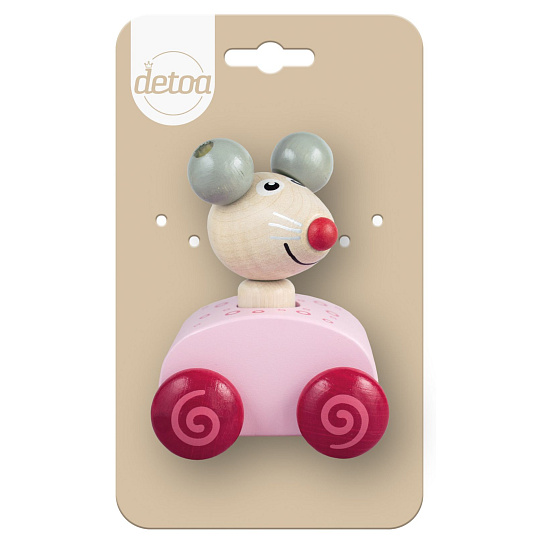 Dřevěné pískací zvířátko ve tvaru myšky, po zmáčknutí hlavičky zapiští. Kolečka jsou funkční, v růžovém provedení. Vhodné pro děti od 1 roku.