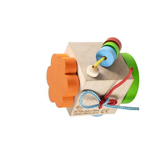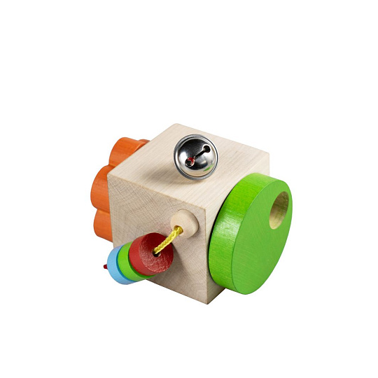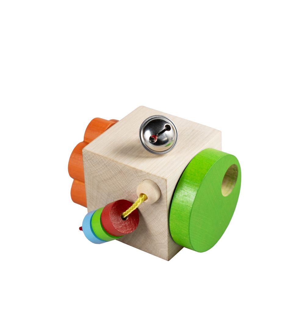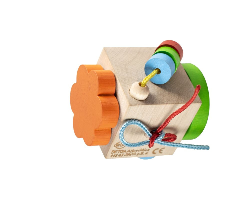 Montessori kostka, obasahujíc několik variant drobných činností k procvičení motorických schopností dítěte. Vhodné pro děti od 18m. Velikost hračky 70x70x70mm. Upevněno na paírové kartě