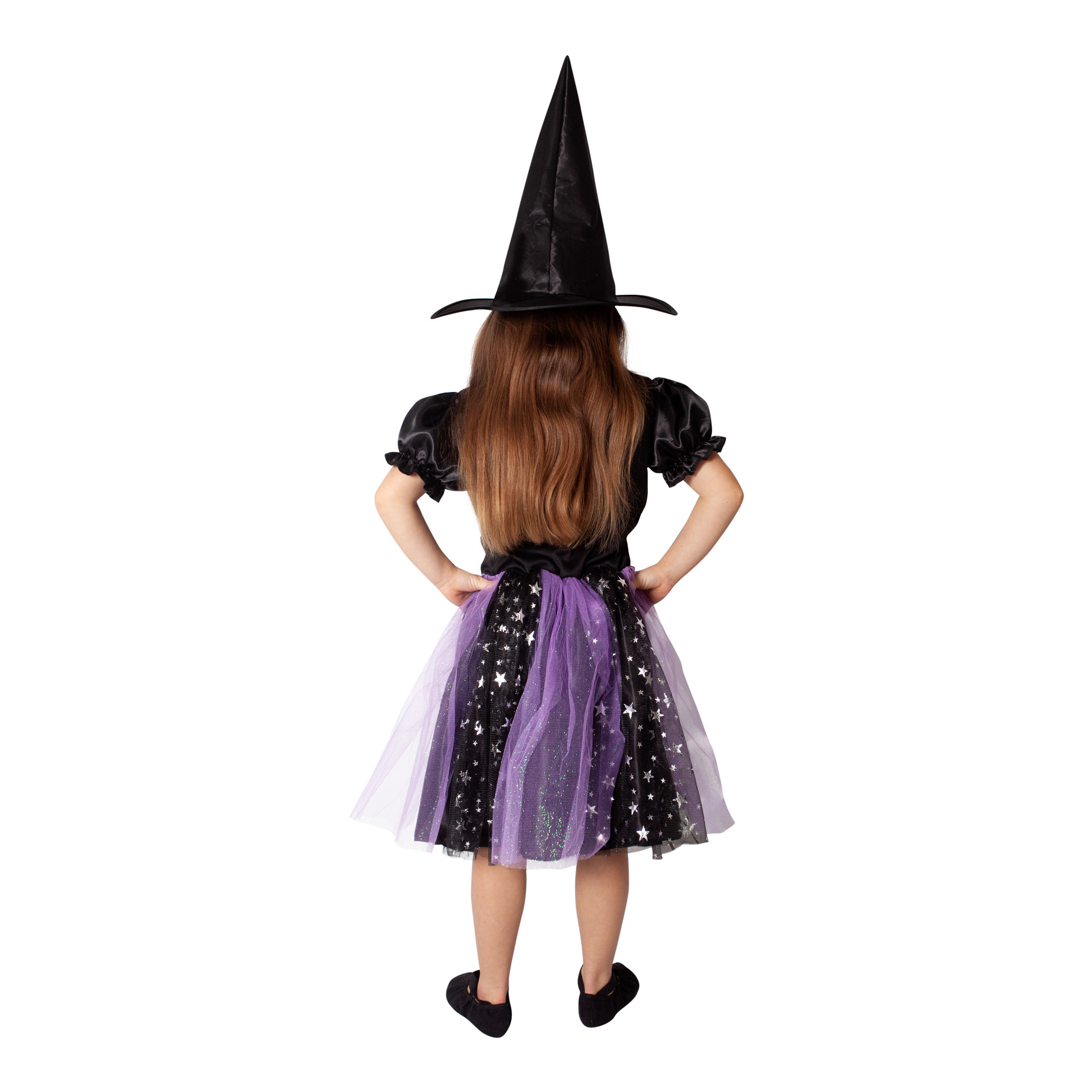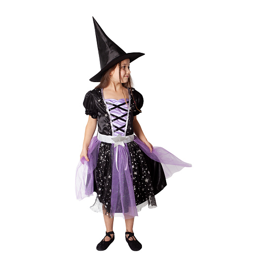 Parádní karnevalový kostým s motivem čarodějnice! Kostým fialovo-černé barvy ve velikosti M je určen pro holčičky ve věkovém rozmezí 6-8 let (117-128 cm). Šaty jsou zdobené potiskem stříbrných hvězdiček. Součástí balení je perfektně sladěný klobouk. Staň se hvězdou karnevalového nebo Halloweenského večírku! Nejen letos je potřeba myslet EKO-nomicky i EKO-logicky! EKO-balení je vhodné zejména pro e-shopy kde zákazník nakupuje dle fotografie a není třeba velkého balení s věšákem. EKO-logicky – na balení bylo použito méně plastu a dalších materiálů. Jedná se o malý transparentní obal s fotografií. EKO-nomicky –EKO-obal zabere jen polovinu místa – šetřete skladová místa s námi!