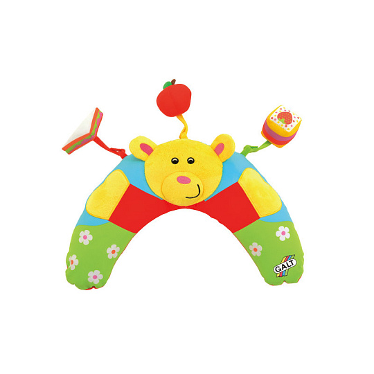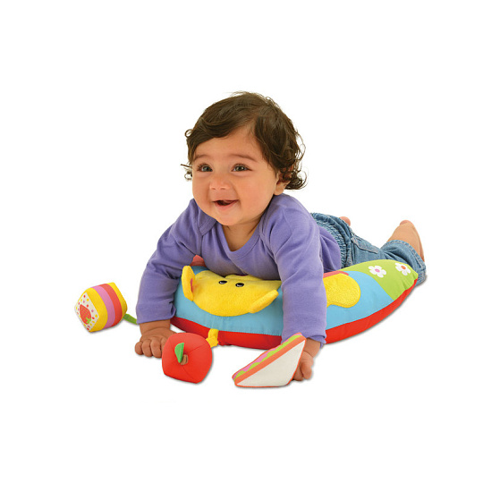 Nafukovací podložka je pokrytá látkou a je tak příjemným podkladem pod bříško dítěte pří zkoumání hraček připevněných na podložce.