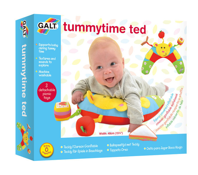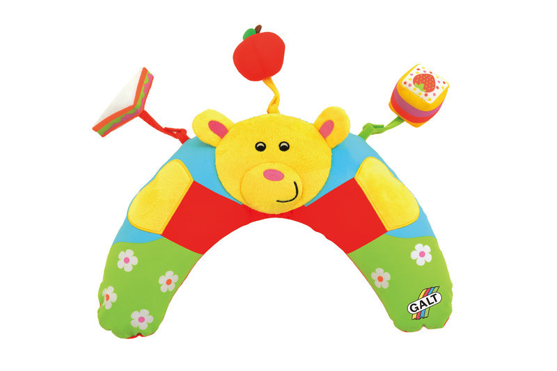 Nafukovací podložka je pokrytá látkou a je tak příjemným podkladem pod bříško dítěte pří zkoumání hraček připevněných na podložce.