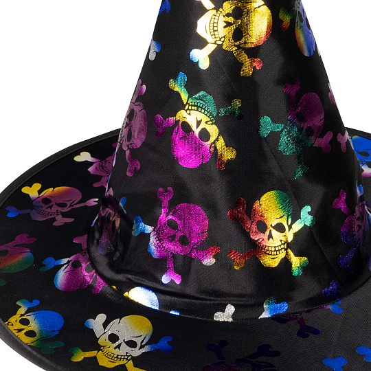 Kouzelný klobouk černé barvy zdoben barevnými magickými lebkami. Tento klobouk je ideální na čarodějnickou nebo halloweenskou oslavu.