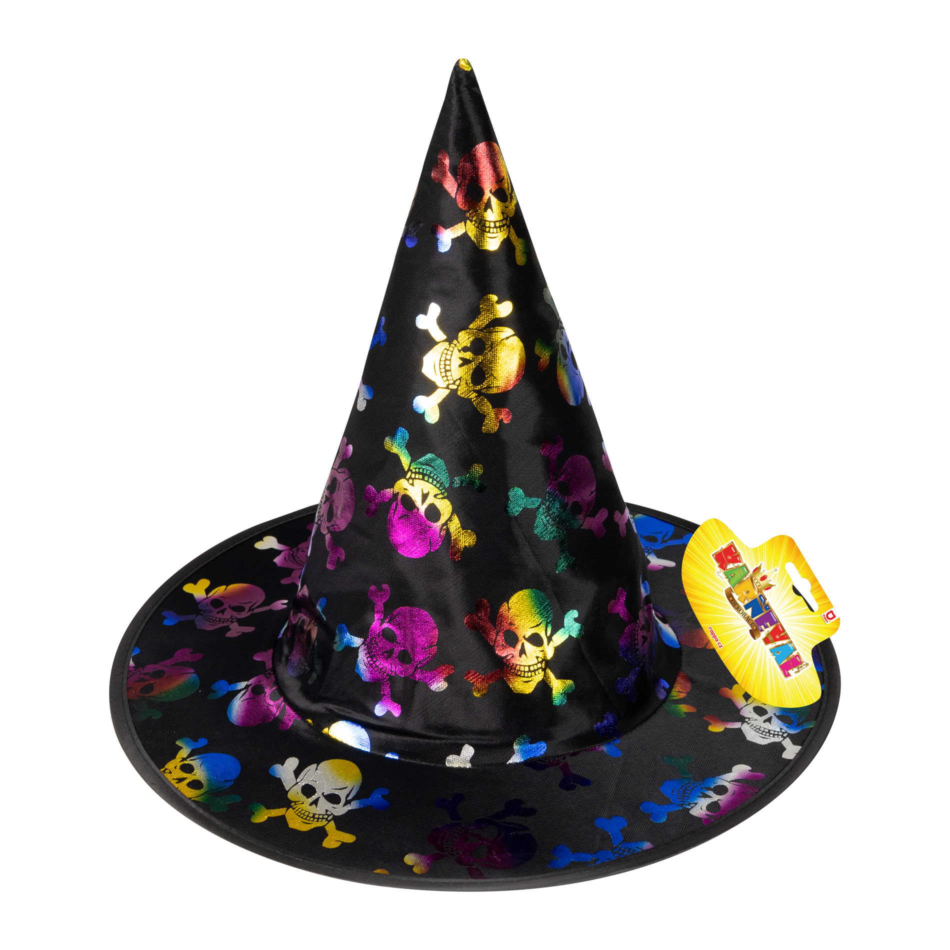 Kouzelný klobouk černé barvy zdoben barevnými magickými lebkami. Tento klobouk je ideální na čarodějnickou nebo halloweenskou oslavu.
