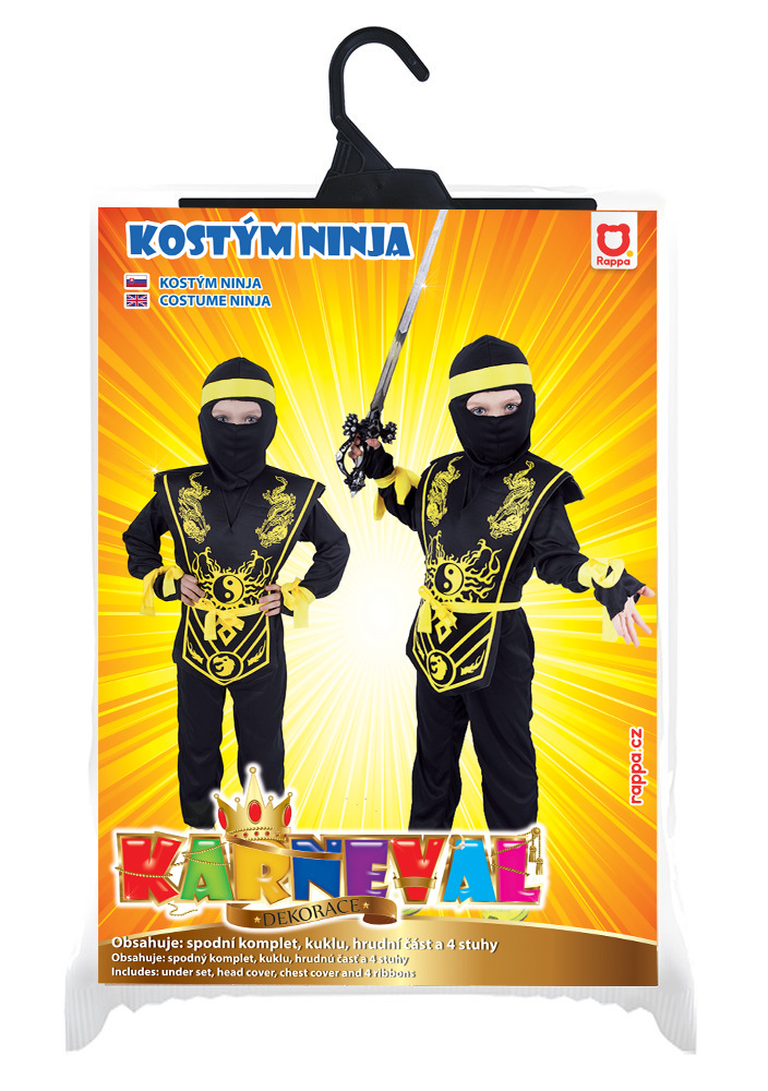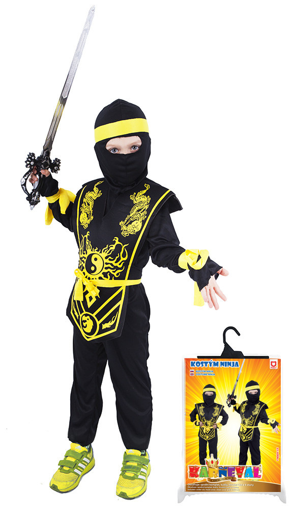 Karnevalový kostým ninja ve velikosti S je určen pro chlapce ve věkovém rozmezí 4-6 let (105-116 cm). Balení obsahuje overal, vestu zdobenou žlutými bojovnými motivy, kuklu, čelenku, opasek a pásky na ruku.