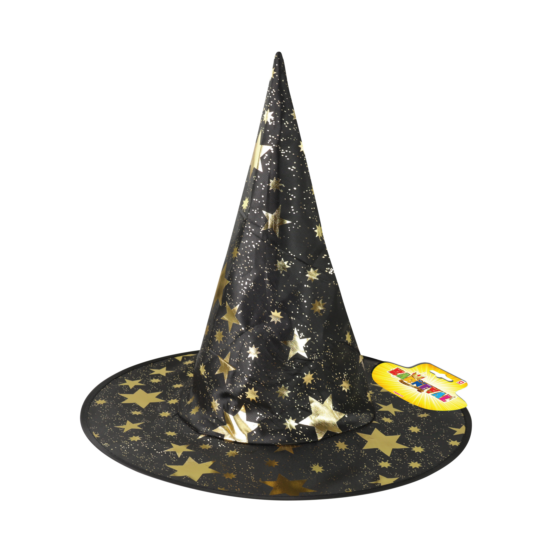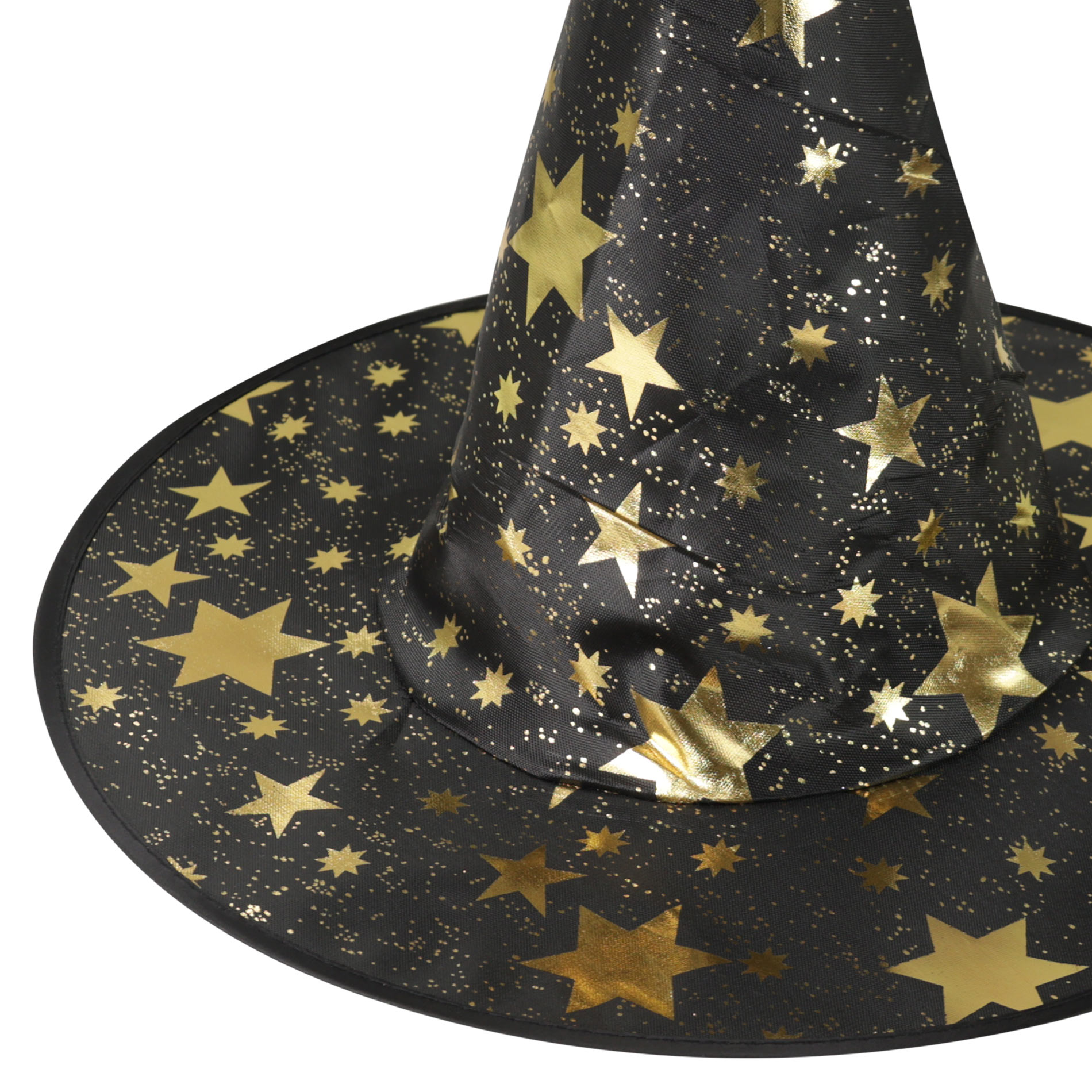 Úžasný čarodějnický klobouk v černé barvě s potiskem zlatých hvězdiček. Ideální i na halloweenský večírek nebo karneval!
