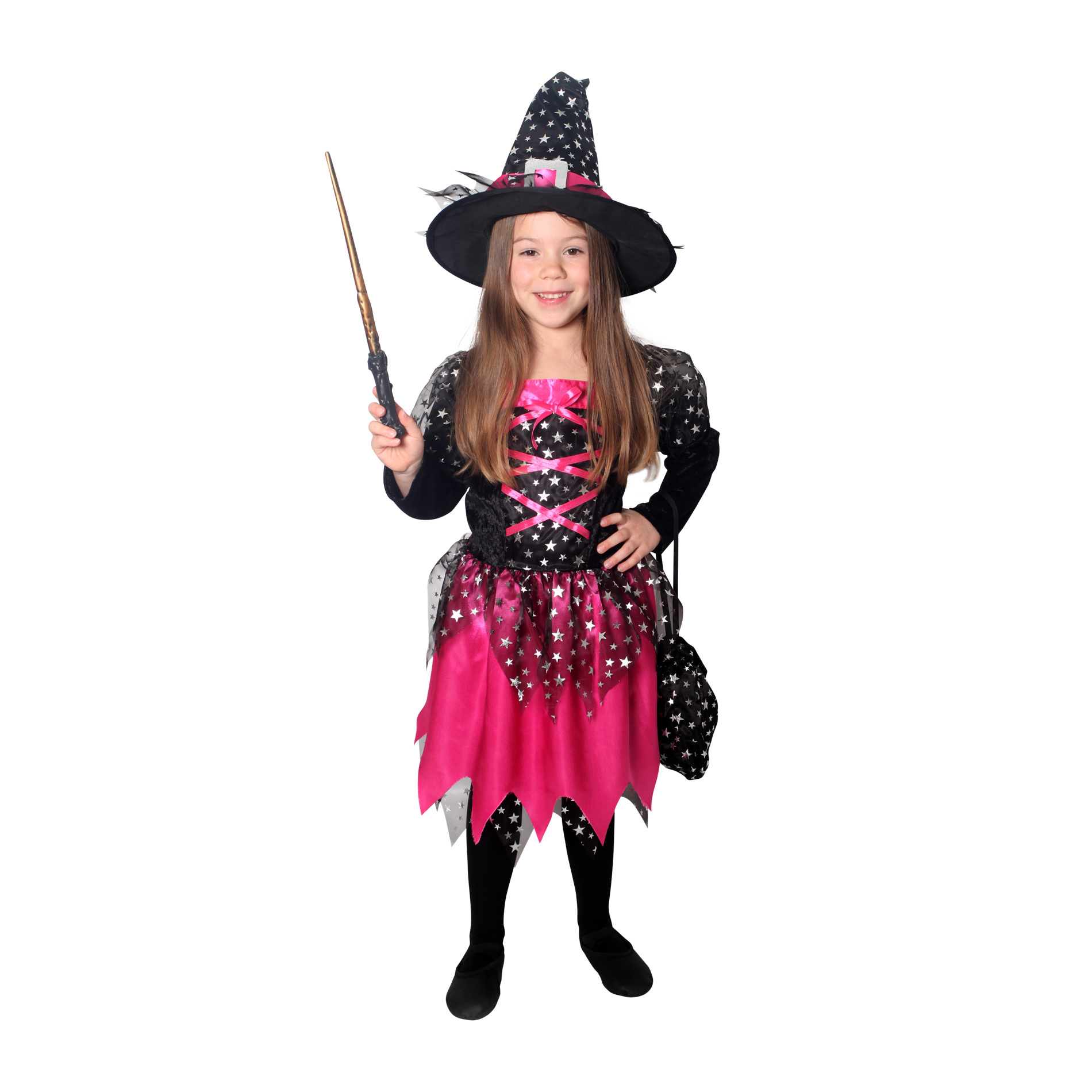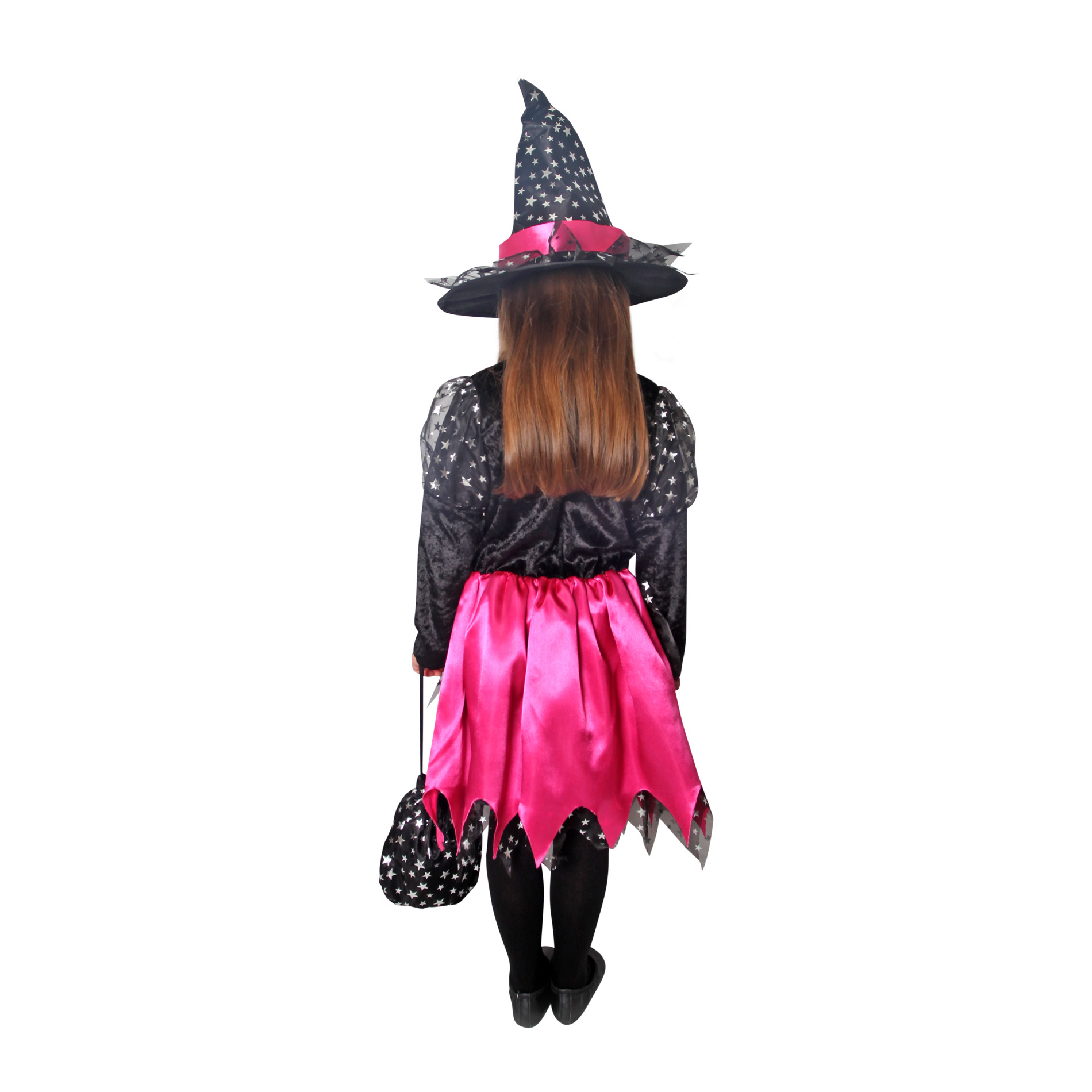 Magický karnevalový kostým pro malé čarodějnice! Kostým černo-růžové barvy ve velikosti M je určen pro holčičky ve věkovém rozmezí 6-8 let (117-128 cm). Šaty jsou dekorovány růžovými stuhami a stříbrnými hvězdičkami. Součástí kostýmu je perfektně sladěný čarodějnický klobouk a taštička. S tímto úchvatným kostýmem se zaručeně staneš hvězdou karnevalu i Halloweenu!