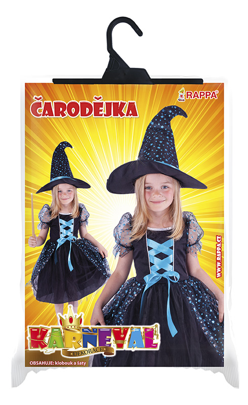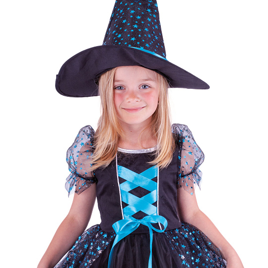 Parádní karnevalový kostým s motivem čarodějnice! Kostým modro-černé barvy ve velikosti S je určen pro holčičky ve věkovém rozmezí 4-6 let (105-116 cm). Šaty jsou zdobené tyrkysově modrou stuhou a metalickými hvězdičkami. Součástí balení je perfektně sladěný klobouk, který je rovněž zdoben modrými hvězdičkami a stuhou. Staň se hvězdou kar