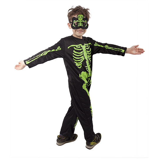 Strašidelný karnevalový kostým s motivem kostlivce! Kostým ve velikosti S je určen pro chlapečky ve věkovém rozmezí 4-6 let (110-116 cm). Balení obsahuje černou kombinézu a masku s motivem zeleného kostlivce. Nejen letos je potřeba myslet EKO-nomicky i EKO-logicky! EKO-balení je vhodné zejména pro e-shopy kde zákazník nakupuje dle fotografie a není třeba velkého balení s věšákem. EKO-logicky – na balení bylo použito méně plastu a dalších materiálů. Jedná se o malý transparentní obal s fotografií. EKO-nomicky –EKO-obal zabere jen polovinu místa – šetřete skladová místa s námi!