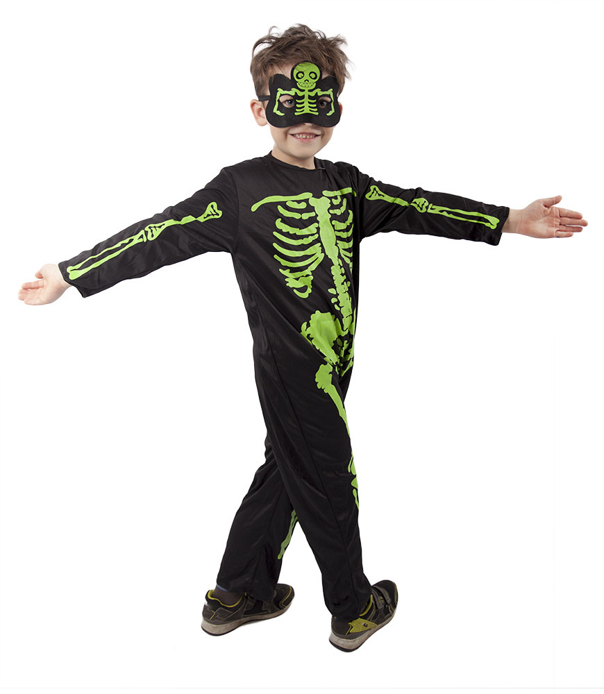 Strašidelný karnevalový kostým s motivem kostlivce! Kostým ve velikosti S je určen pro chlapečky ve věkovém rozmezí 4-6 let (110-116 cm). Balení obsahuje černou kombinézu a masku s motivem zeleného kostlivce. Nejen letos je potřeba myslet EKO-nomicky i EKO-logicky! EKO-balení je vhodné zejména pro e-shopy kde zákazník nakupuje dle fotografie a není třeba velkého balení s věšákem. EKO-logicky – na balení bylo použito méně plastu a dalších materiálů. Jedná se o malý transparentní obal s fotografií. EKO-nomicky –EKO-obal zabere jen polovinu místa – šetřete skladová místa s námi!