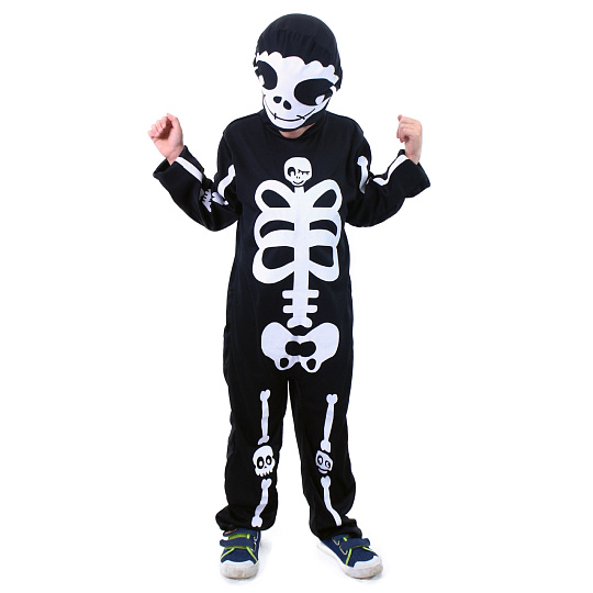 Strašidelný karnevalový kostým s motivem kostlivce! Kostým ve velikosti M je určen pro děti ve věkovém rozmezí 6-8 let (117-128 cm). Balení obsahuje černou kombinézu a masku s bílým potiskem kostry.