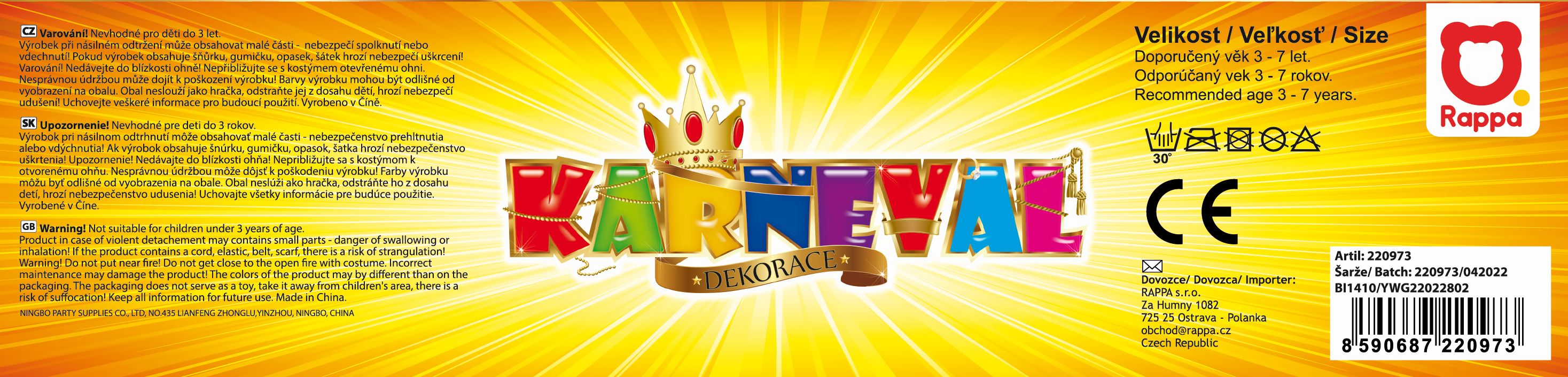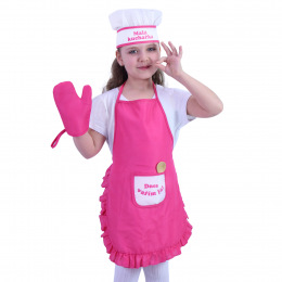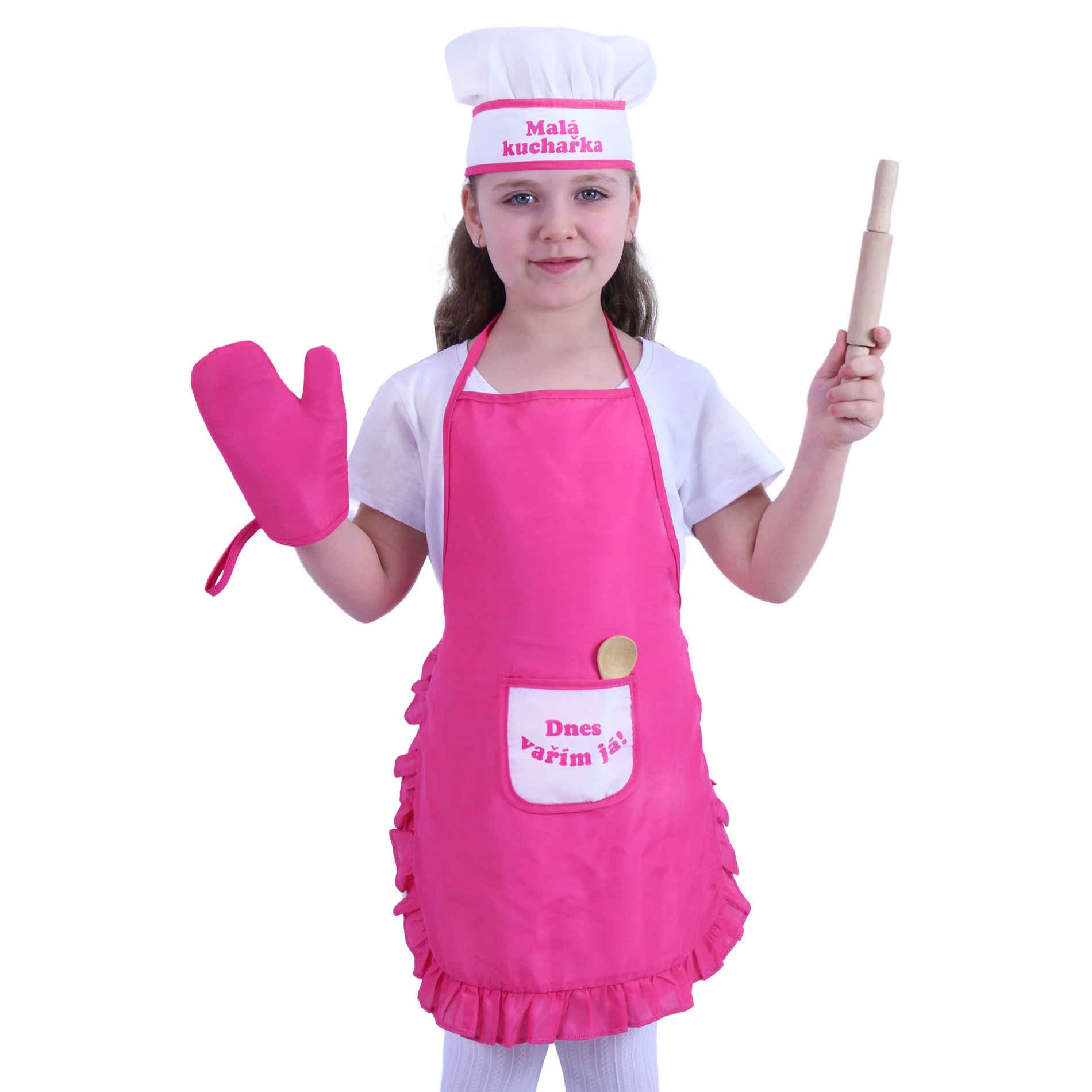 Kostým pro každou malou kuchařku! Ružová zástěra se zavazováním kolem krku a pasu, na které je našita malá kapsička s českým nápisem Dnes vařím já! No a co by to bylo za kuchařku bez parádní kuchařské čepice a chňapky! Set je doplněn o dřevěný váleček a vařečku. Kostým je vhodný pro holčičky ve věkovém rozmezí 4-10 let (110-150 cm).