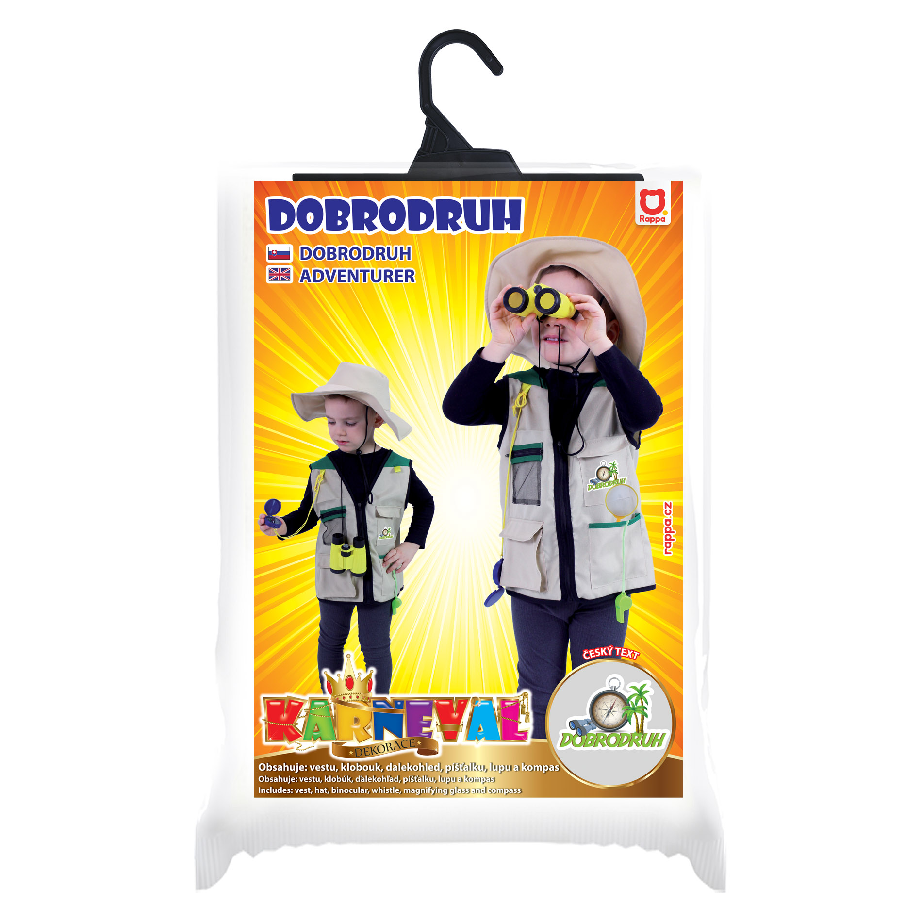 Vydej se na dobrodružnou výpravu s tímto parádním vybavením! Karnevalový kostým ve stylu malého dobrodruha je určen pro chlapečky ve věkovém rozmezí 3-7 let (104-134 cm). Balení obsahuje vestu, klobouk (bez šňůrky), dalekohled, lupu, píšťalku a kompas.