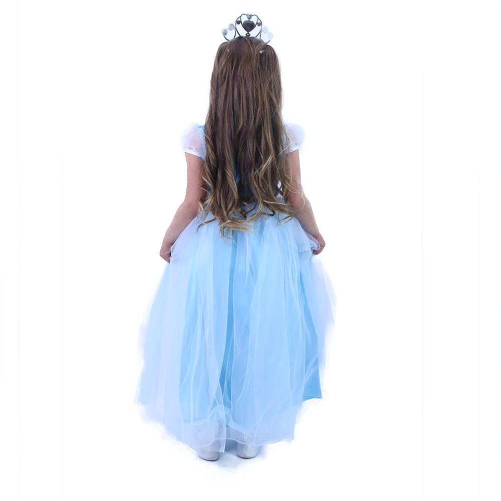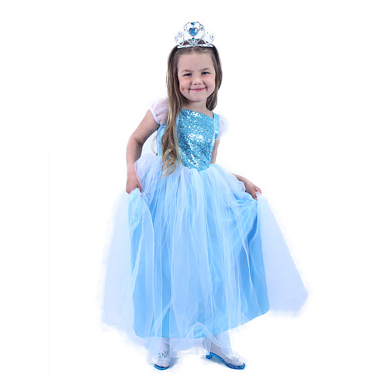 Úchvatný dívčí kostým pro princezny! Kostýmek modré barvy je kombinován s bílým tylem a v horní části dekorován modrými flitry. Kostým princezny ve velikosti M je určen pro holčičky ve věkovém rozmezí 6-8 let (117-128 cm).