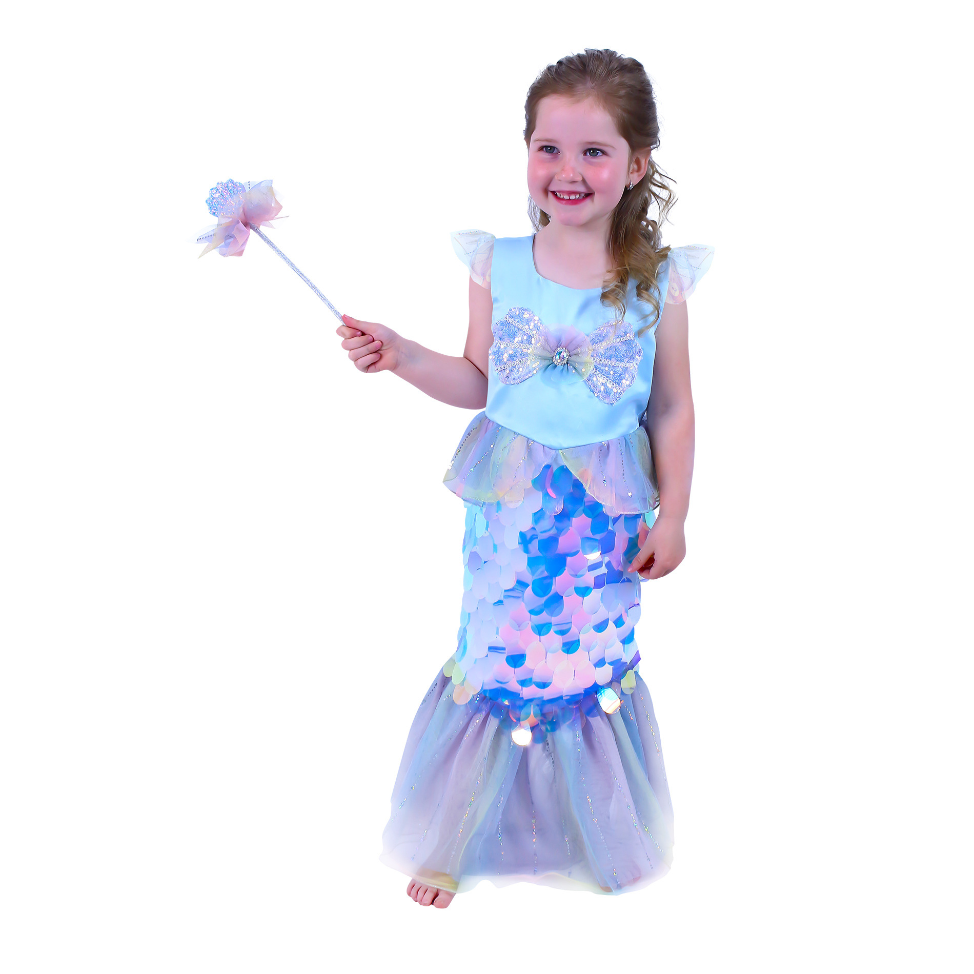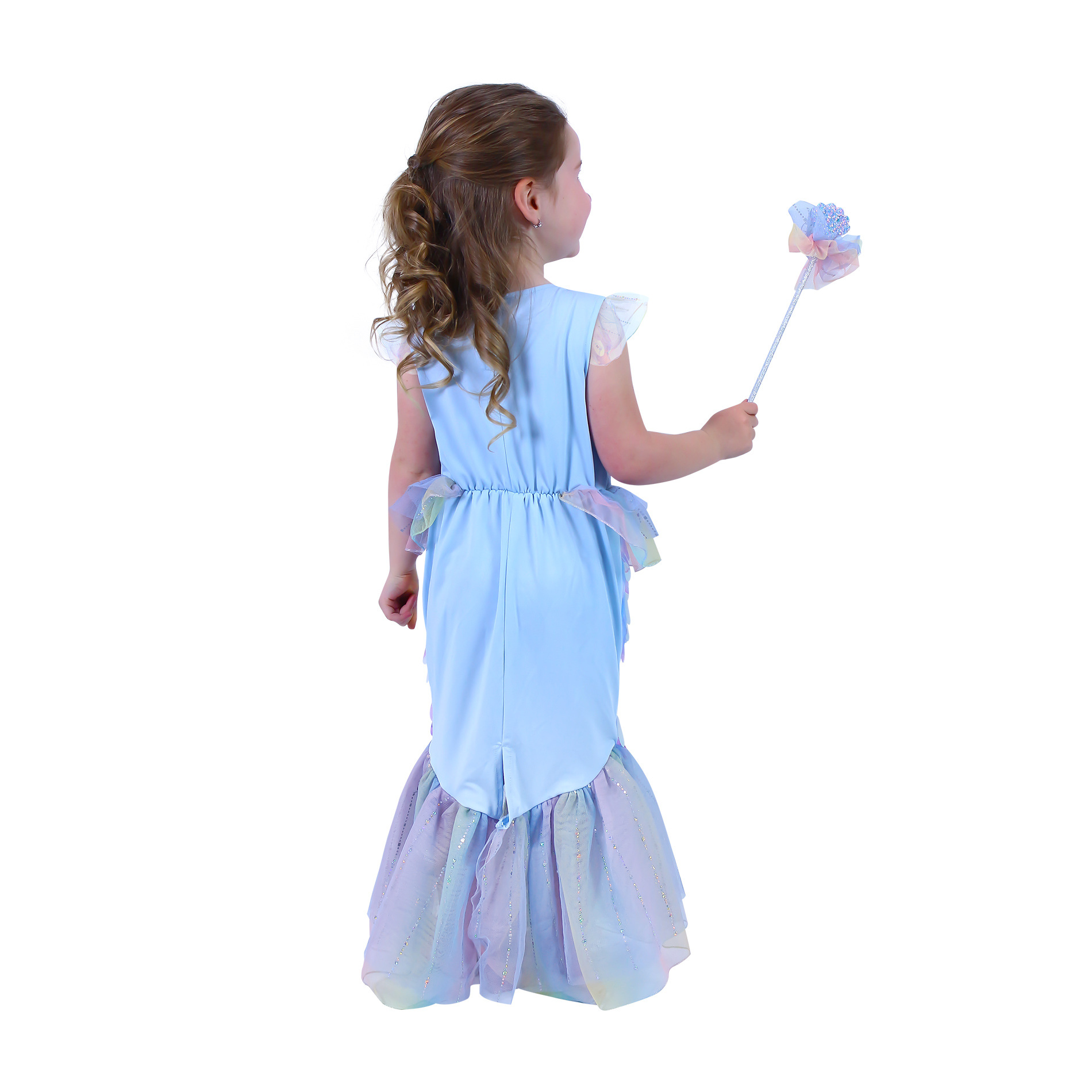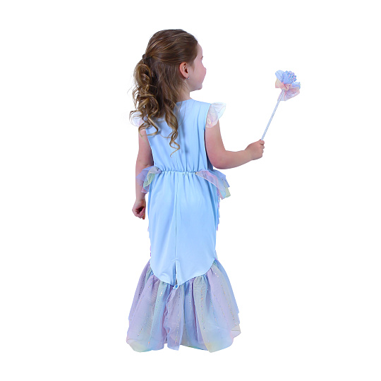 Úchvatný karnevalový kostým s motivem mořské panny! Kostým modré barvy ve velikosti M je určen pro holčičky ve věkovém rozmezí 6-8 let (117-128 cm). Balení obsahuje exkluzivní šaty, které jsou zdobeny flitry, které vypadají jako šupiny, součástí kostýmu je hůlka.