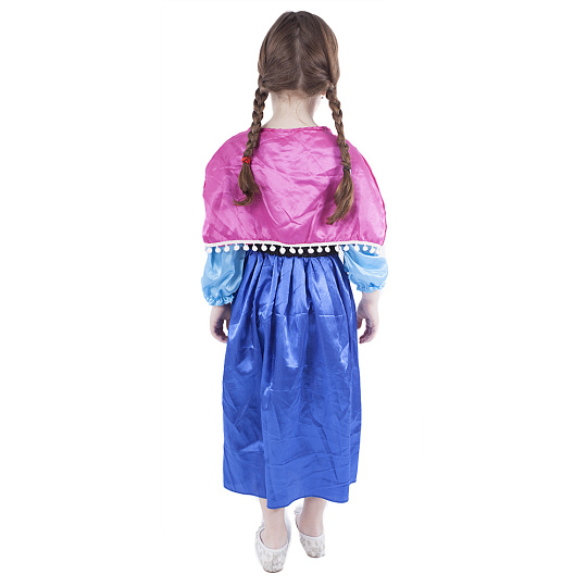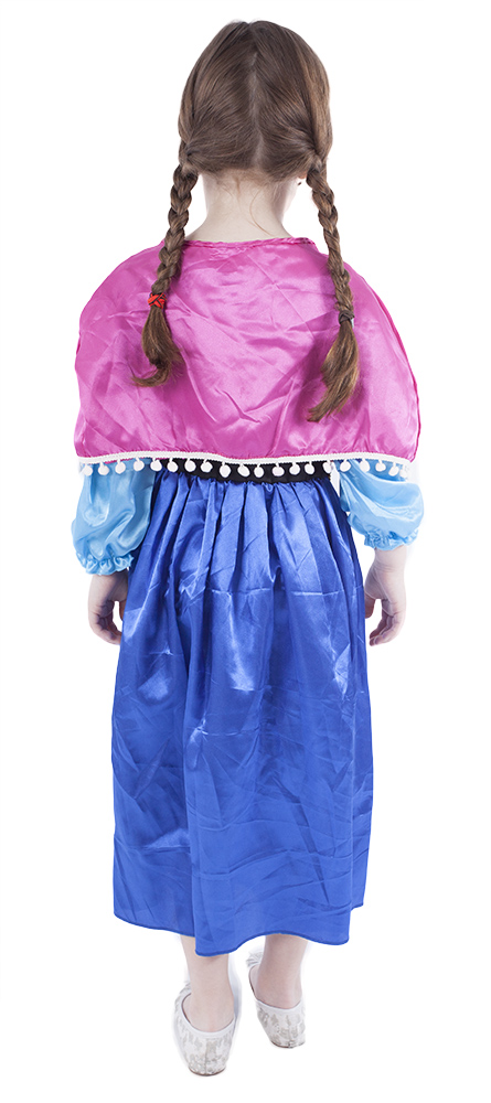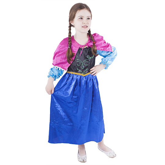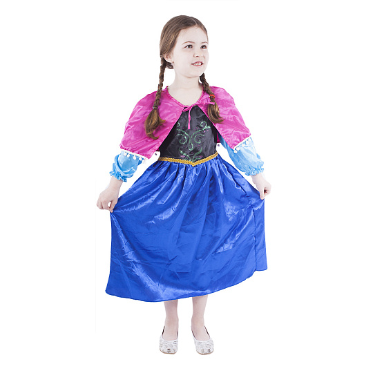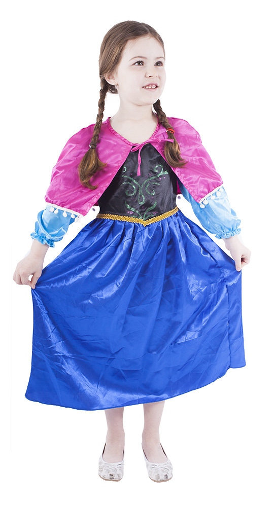 Překrásný dívčí kostým pro všechny sněhové princezny! Kostým ve velikosti S je určen pro holčičky ve věkovém rozmezí 4-6 let (100-116 cm). Velikost se může lišit od vyobrazení na obalu. Kostýmek je ušit v černo-modrých barvách, v horní částí je zdoben potiskem, zlatým lemováním kolem pasu. Součástí je také růžový plášť na mašličku.