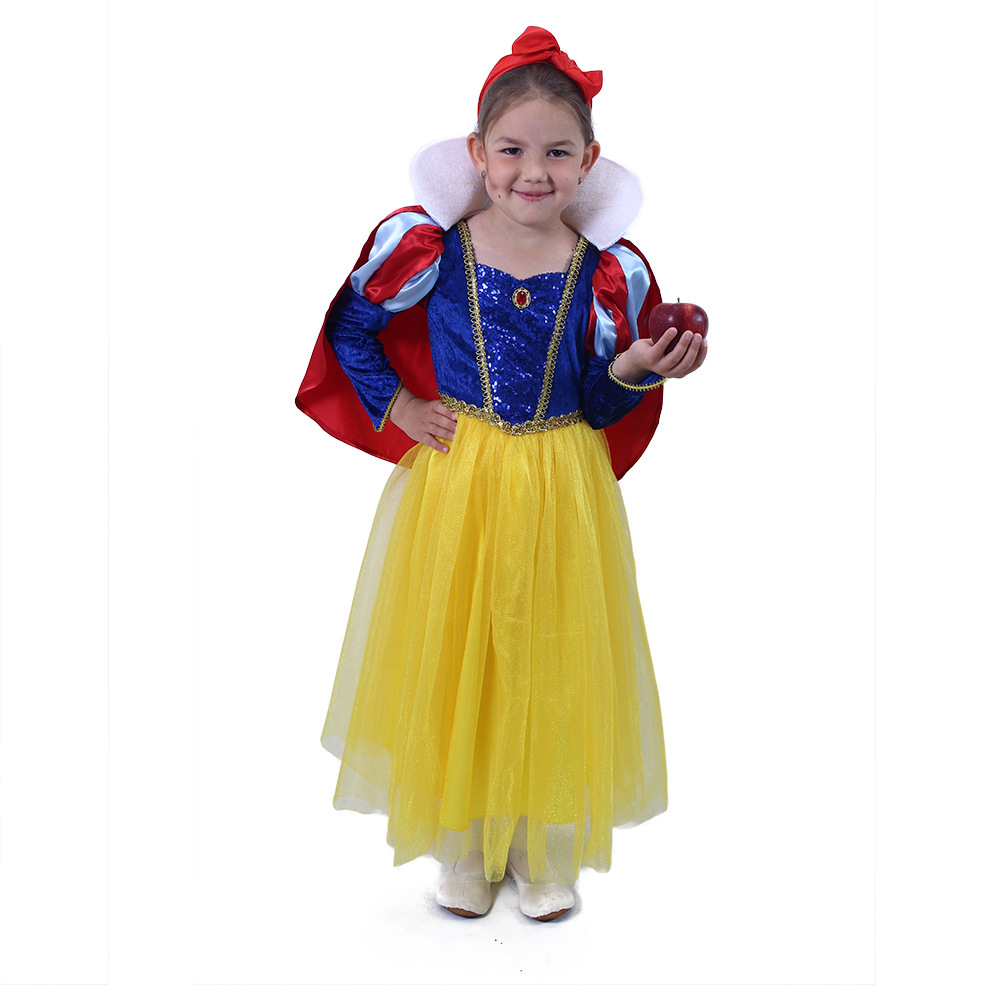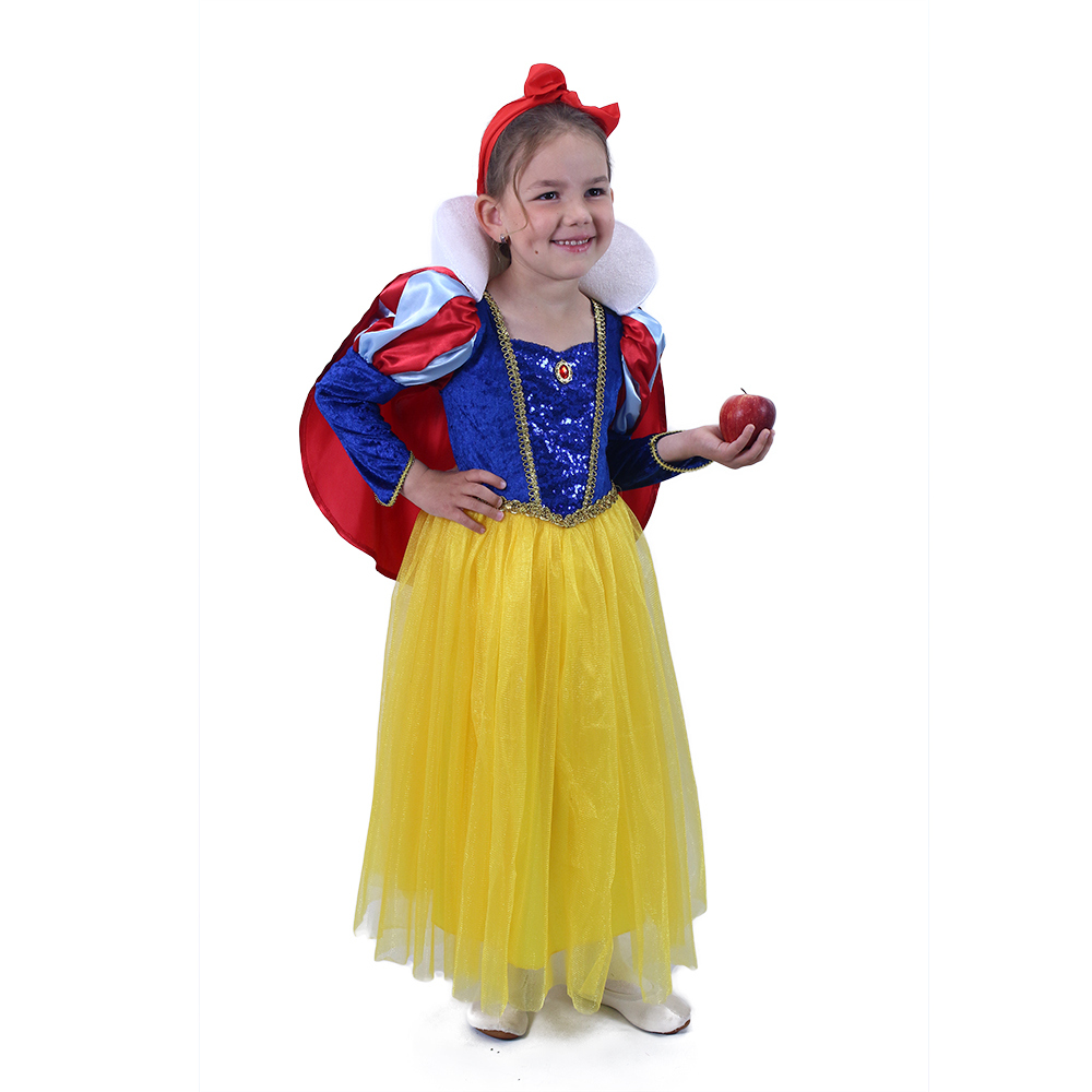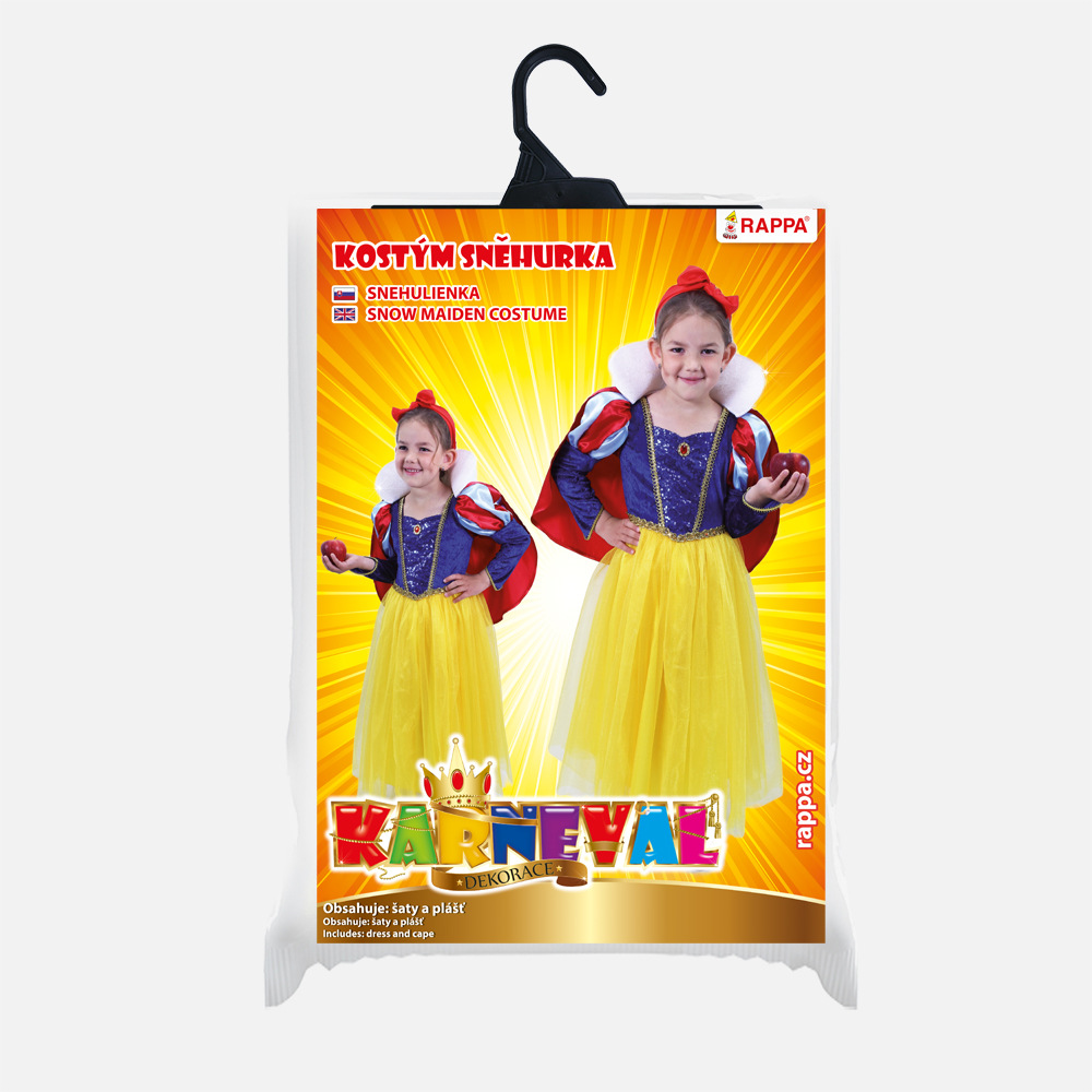 Proměň se během chvilky v půvabnou Sněhurku! Kostýmek o velikosti M je určen pro holčičky ve věkovém rozmezí 6-8 let (117-128 cm). Barevný kostým je dekorován v přední části modrými flitry a zlatým zdobením. Součástí je odnímatelný červený plášť s bílým límcem. Neobsahuje mašli do vlasů.