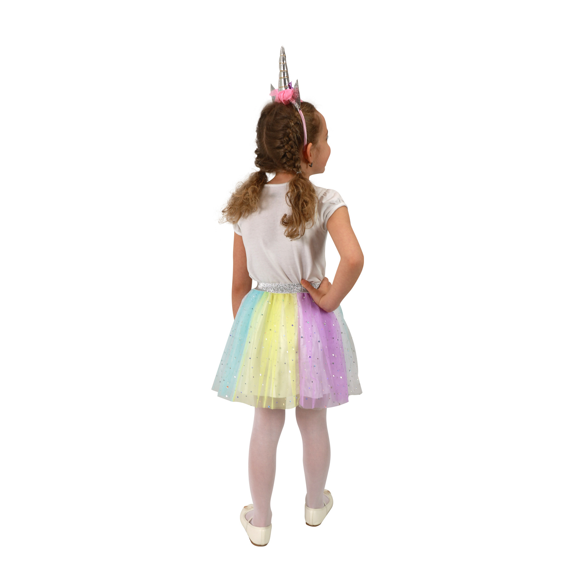 Úchvatná sukýnka TUTU je určena pro holčičky ve věkovém rozmezí 3-7 let. Nadýchaná sukně v duhových barvách je dolněna sříbrnou gumou v pase. Součástí této sady je senzační čelenka jednorožce se sříbrným rohem a barevnými růžemi! Délka sukýnky je cca 30 cm.