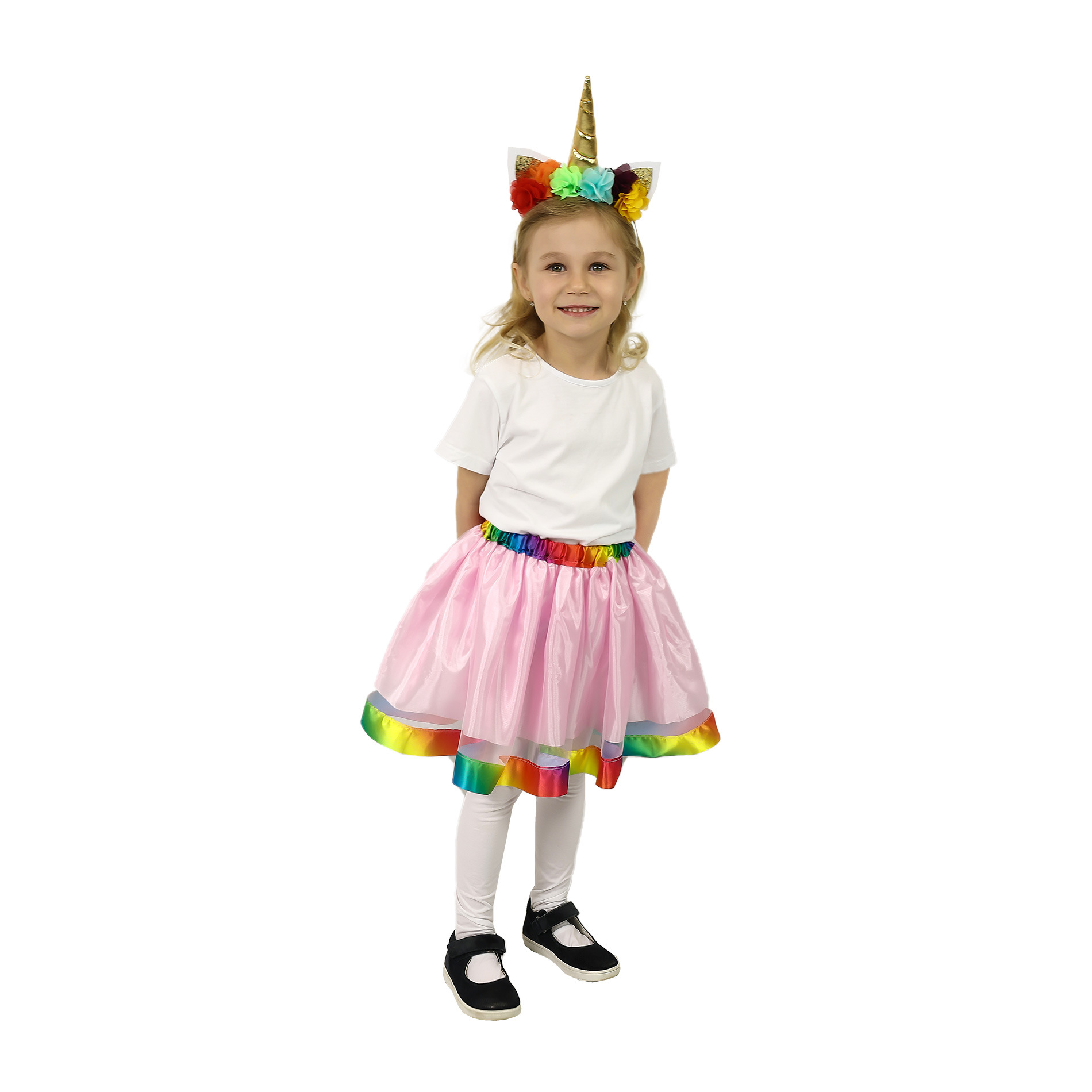Roztomilá sukýnka TUTU je určena pro holčičky ve věkovém rozmezí 3-7 let (104-146 cm), obvod pasu 46-75 cm. Tento úchvatný kousek v růžové barvě je zdoben duhovým saténovým lemováním. Součástí této sady je senzační čelenka jednorožce se zlatým rohem a barevnými růžemi! Sukýnka má délku cca 33 cm.