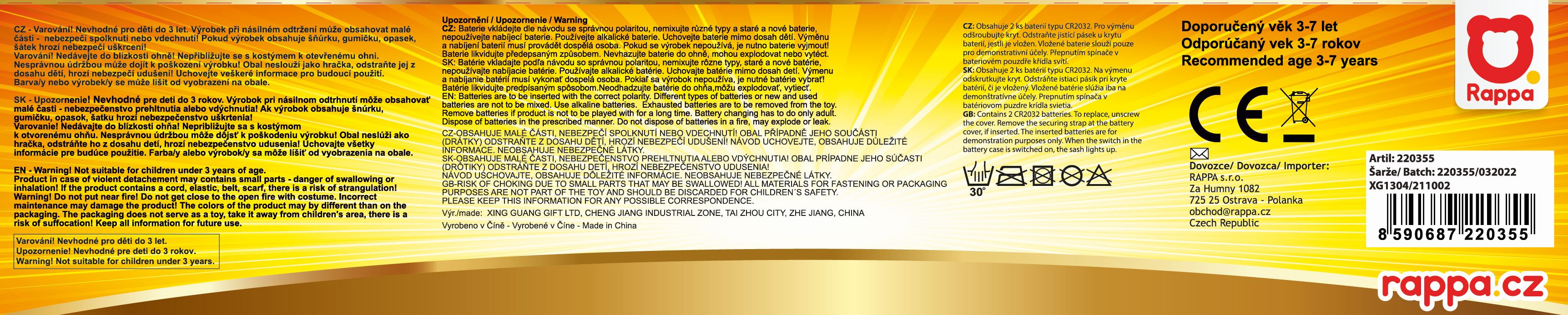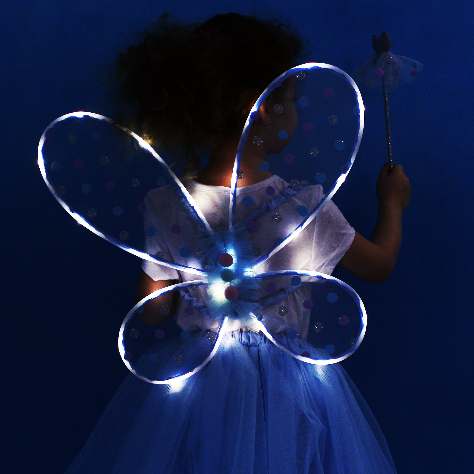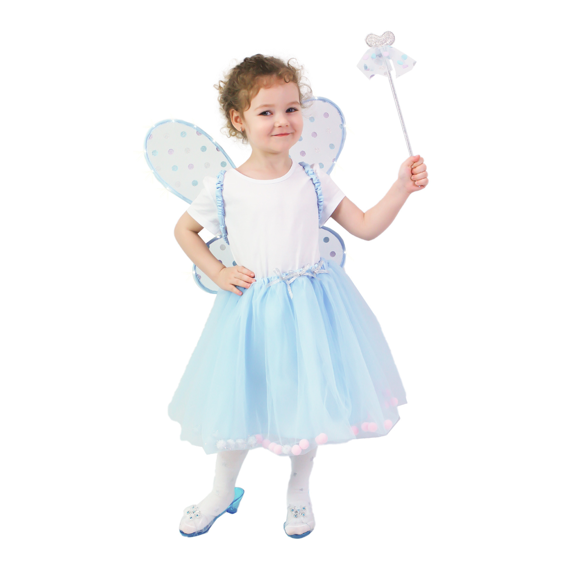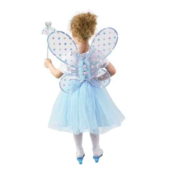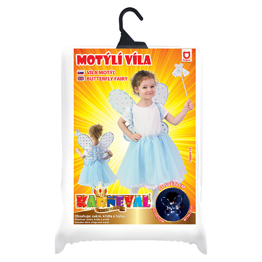 Krásná vílí sada pro malé holčičky! Sada obsahuje modrou tylovou TUTU sukýnku se saténovou spodničkou. Sukně je zdobena ve spodní části kuličkami, k tomu perfektně sladěná křídla a hůlka ve stejném motivu. V lemování křídel jsou zabudována světýlka, která po zapnutí svítí. Baterie jsou součástí. Sukně je dlouhá cca 36 cm a je vhodná pro obvod pasu 50-60 cm. Určeno pro holčičky ve věkovém rozmezí 3-10 let (104-146 cm).