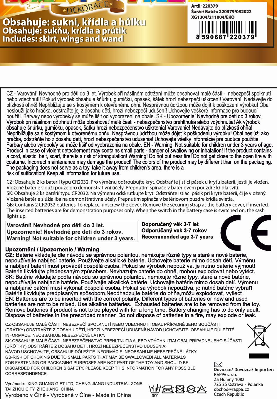Krásná vílí sada pro malé holčičky! Sada obsahuje růžovou tylovou TUTU sukýnku se saténovou spodničkou. Sukně je zdobena ve spodní části kuličkami, k tomu perfektně sladěná křídla a hůlka ve stejném motivu. V lemování křídel jsou zabudována světýlka, která po zapnutí svítí. Baterie jsou součástí. Sukně je dlouhá cca 36 cm a je vhodná pro obvod pasu 50-60 cm. Určeno pro holčičky ve věkovém rozmezí 3-10 let (104-146 cm). Nejen letos je potřeba myslet EKO-nomicky i EKO-logicky! EKO-balení je vhodné zejména pro e-shopy kde zákazník nakupuje dle fotografie a není třeba velkého balení s věšákem. EKO-logicky – na balení bylo použito méně plastu a dalších materiálů. Jedná se o malý transparentní obal s fotografií. EKO-nomicky –EKO-obal zabere jen polovinu místa – šetřete skladová místa s námi!