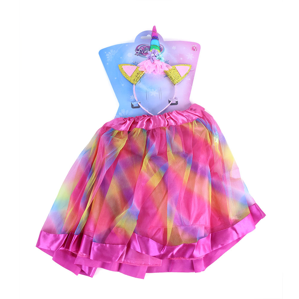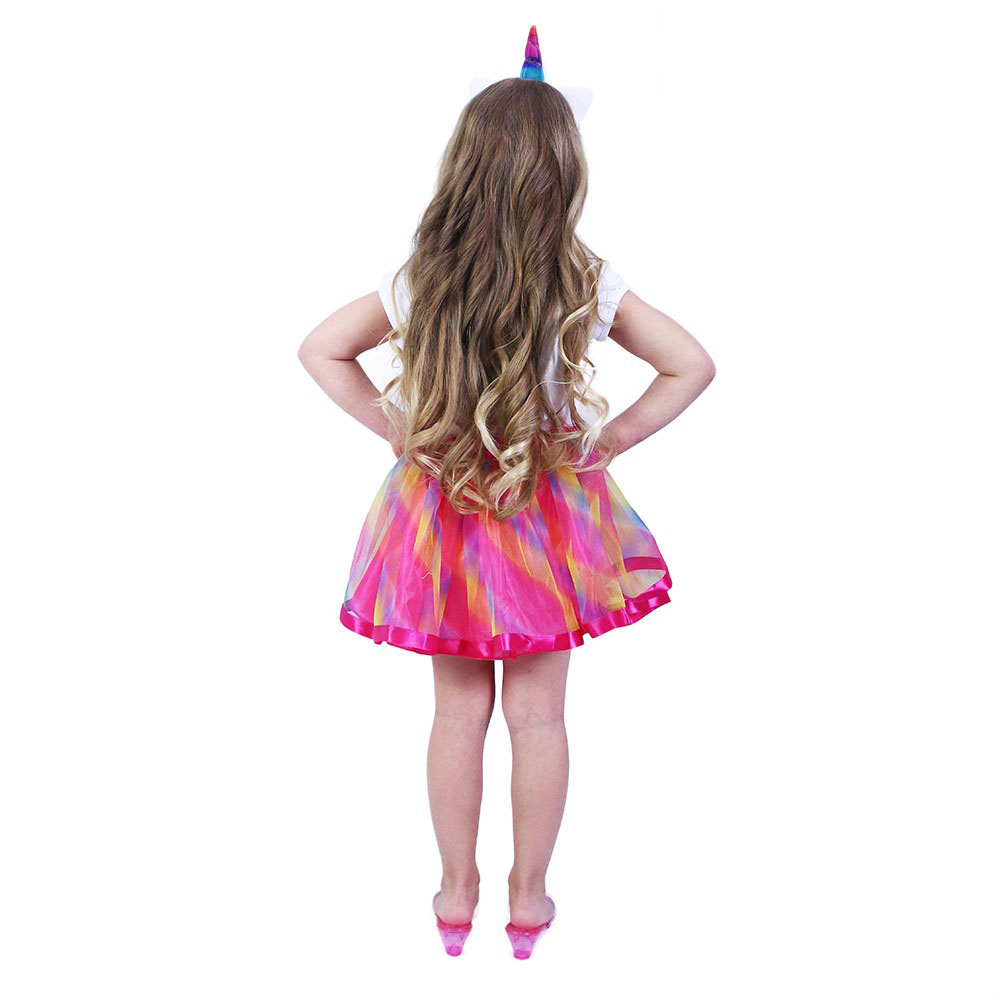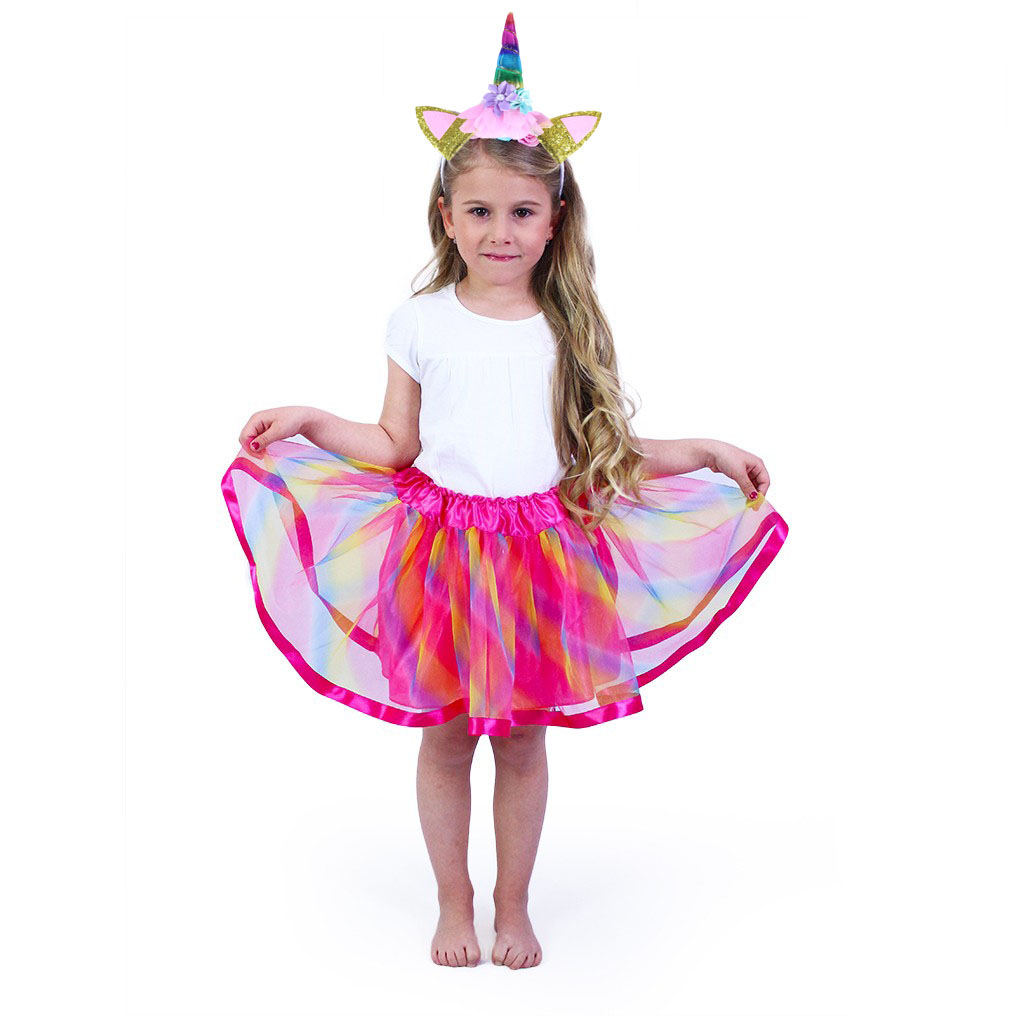 Roztomilá sukýnka TUTU je určena pro holčičky ve věkovém rozmezí 3-7 let (104-146 cm), obvod pasu 48-80 cm. Tento úchvatný kousek v duhových barvách je zdoben saténovým lemováním. Součástí této sady je senzační čelenka jednorožce se zlatým rohem a barevnými růžemi!