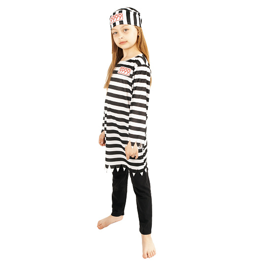 Pruhovaný karnevalový kostým vězeňkyně v typických bílo-černých barvách ve velikosti M je určen pro děvčata ve věku 6-8 let (117-128 cm). Kostým obsahuje dlouhé triko a čepici s číslem vězně.